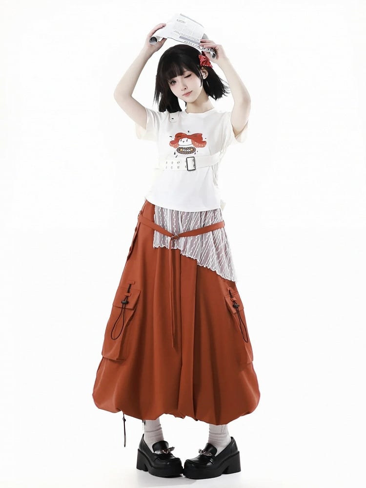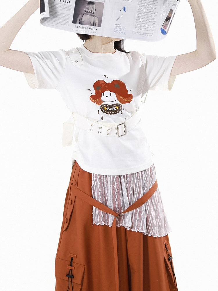 取り外し可能なバックルストラップ付きホワイトカートゥーンプリントTシャツ