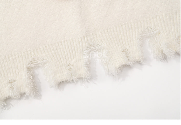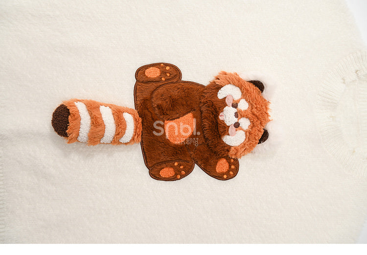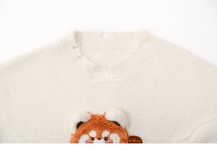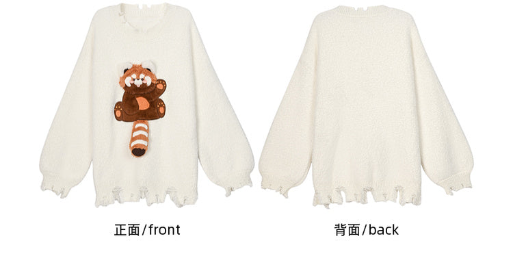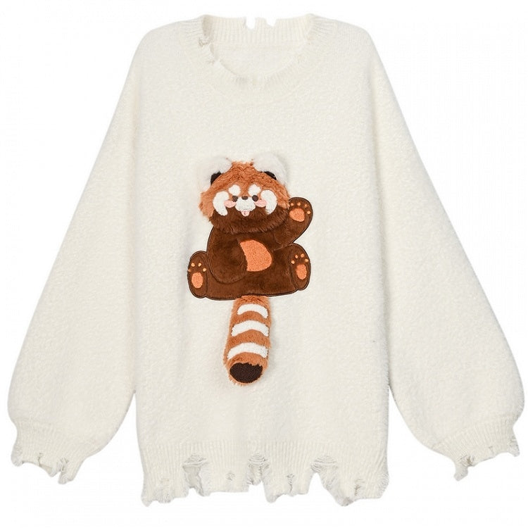 白い可愛いレッサーパンダのディストレストリムのルーズセーター