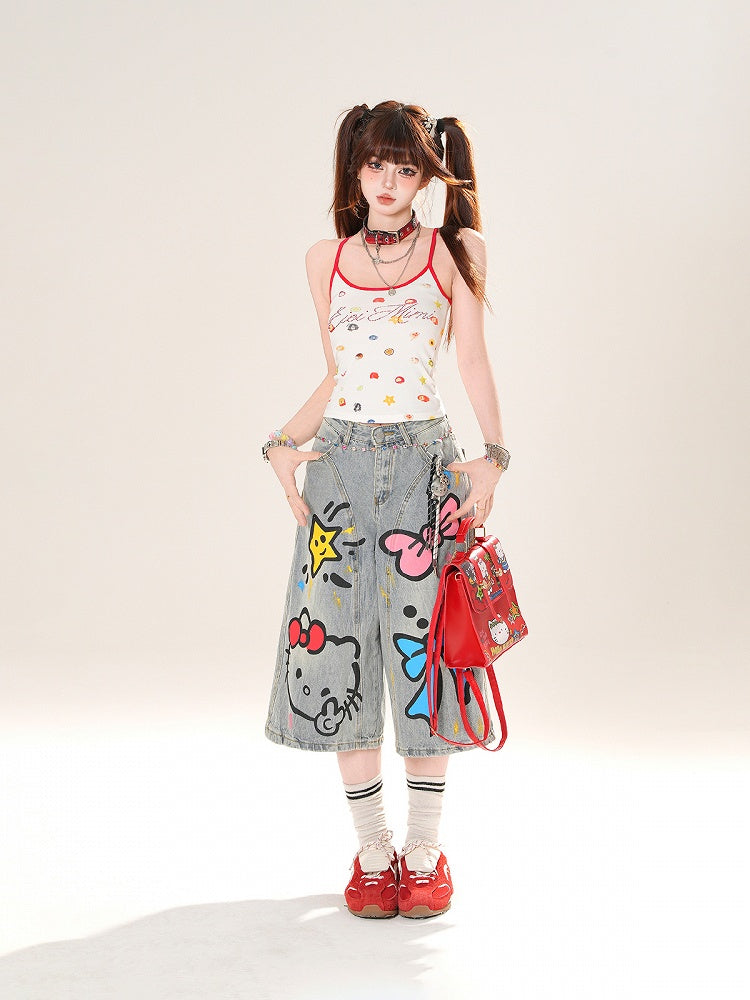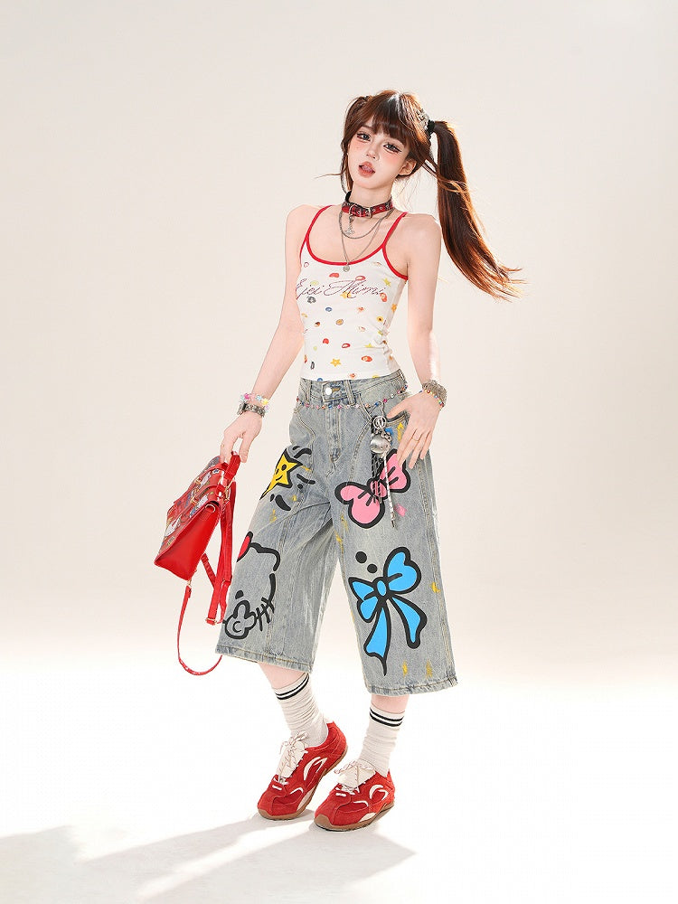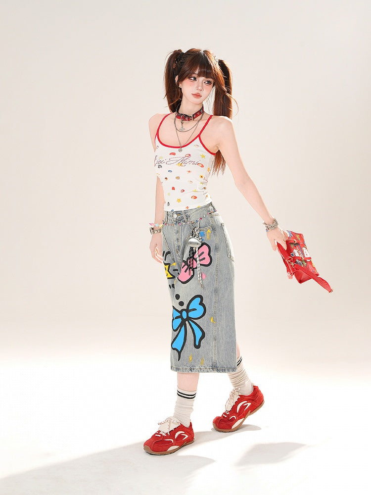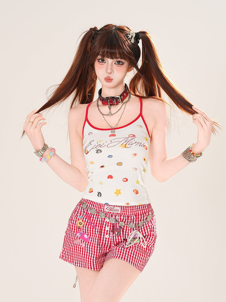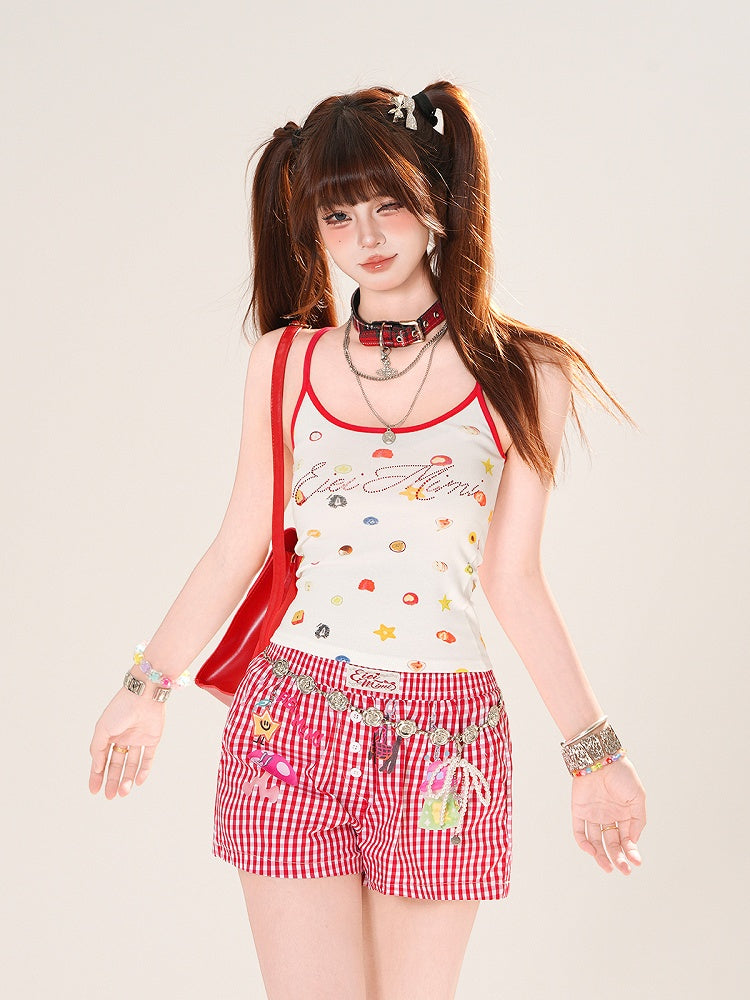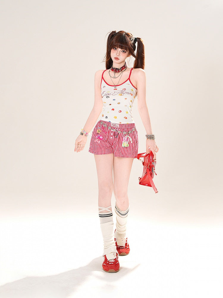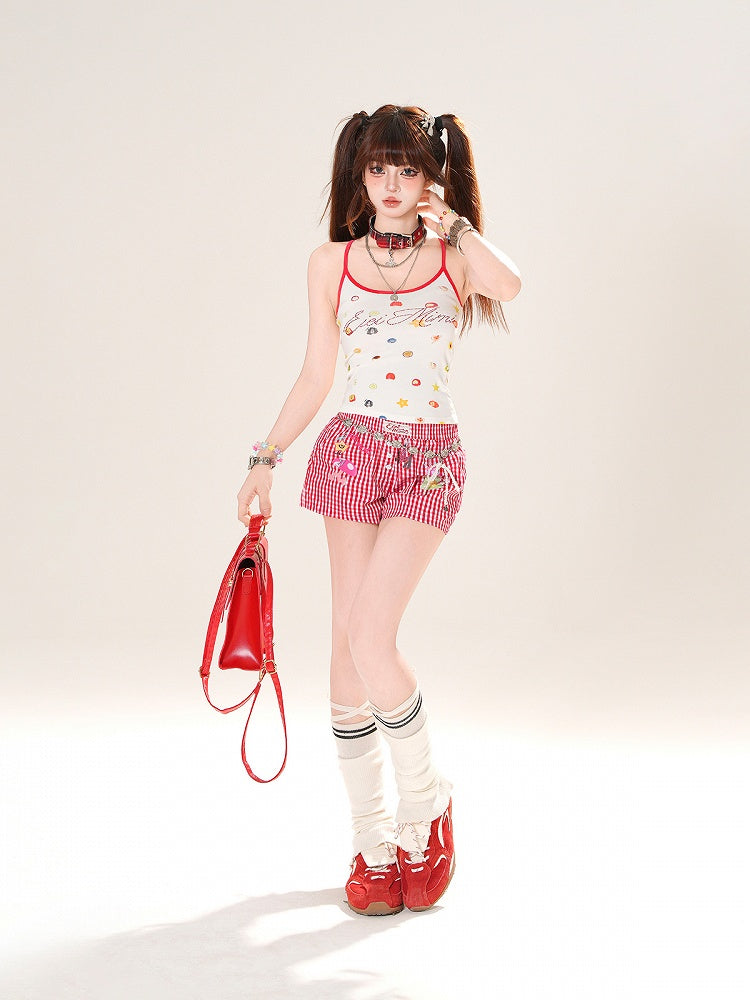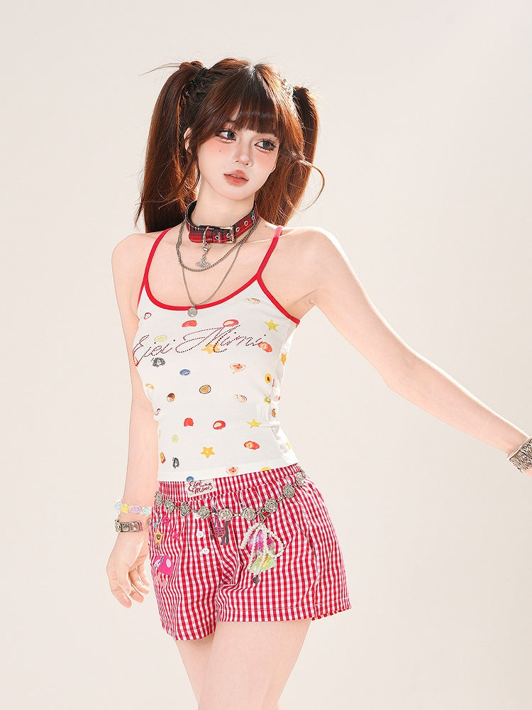 コントラストレッドトリムホワイトキュートプリントスリムフィットキャミソールトップ