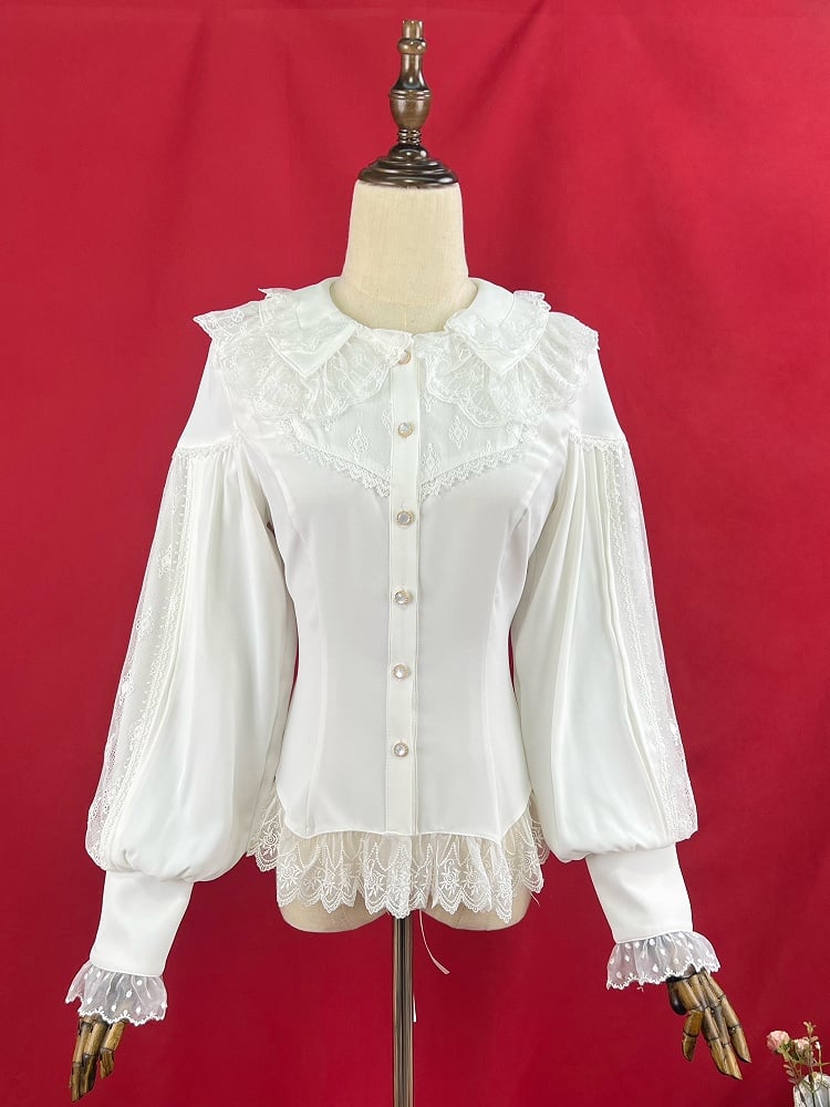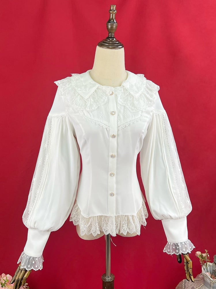 ホワイトのダブルレイヤーカラーのエレガントな長袖シャツ