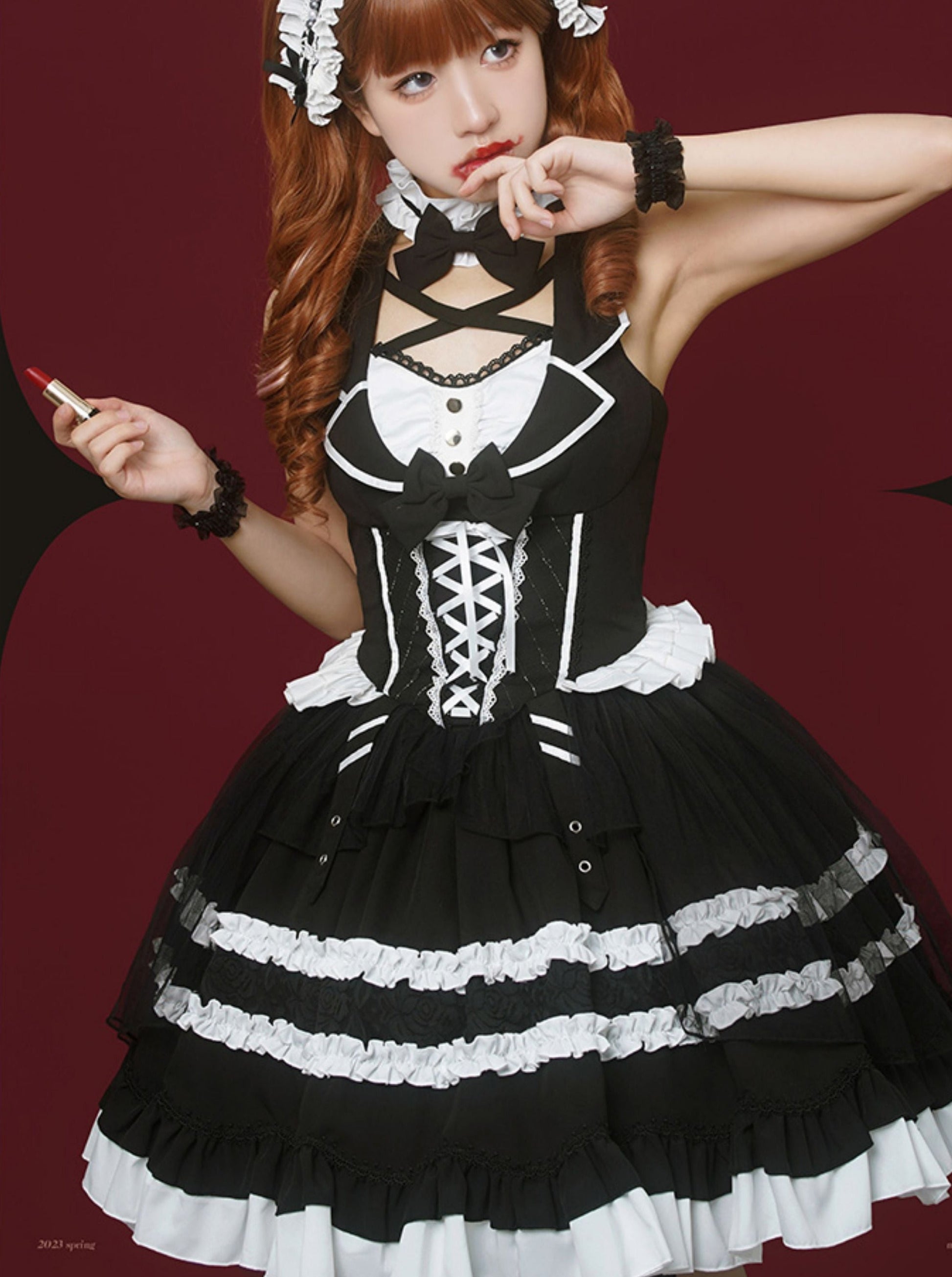 黒と白のオールドスクールロリータファッションドレス蝶結びロリータJSKセット