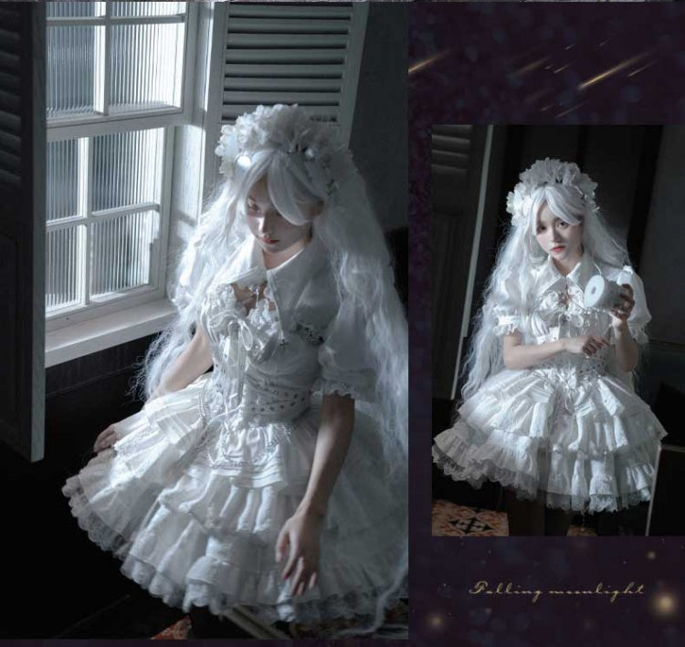 青と白のオールドスクールロリータファッションドレス 蝶結びディテール JSK セット