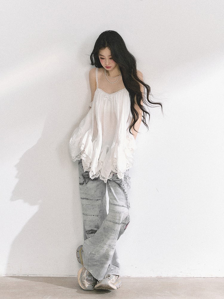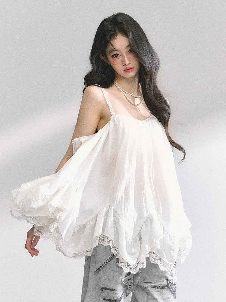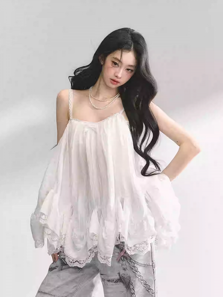 ホワイトハンカチヘムレーストリムシフォンキャミソールトップス