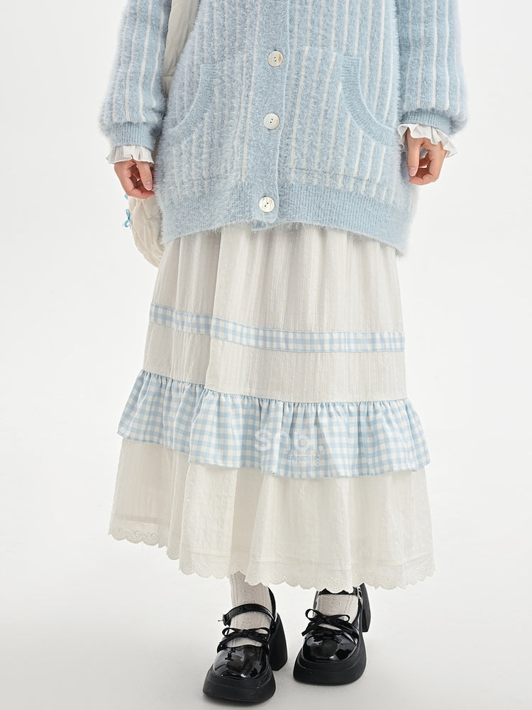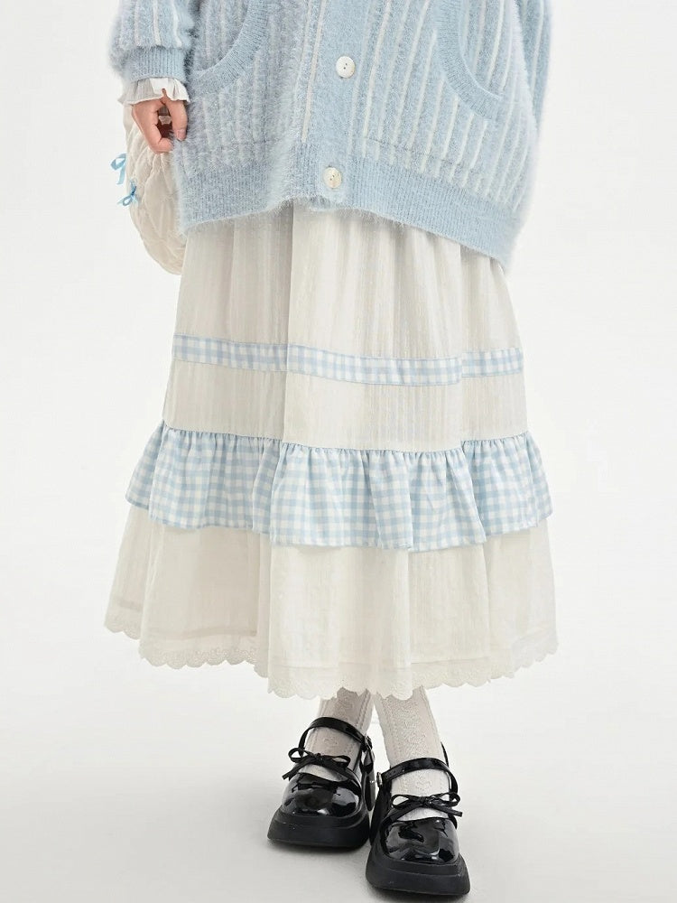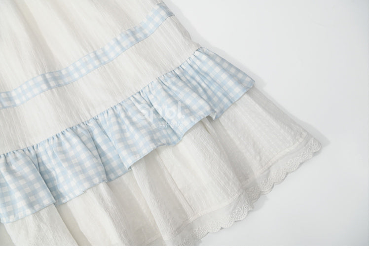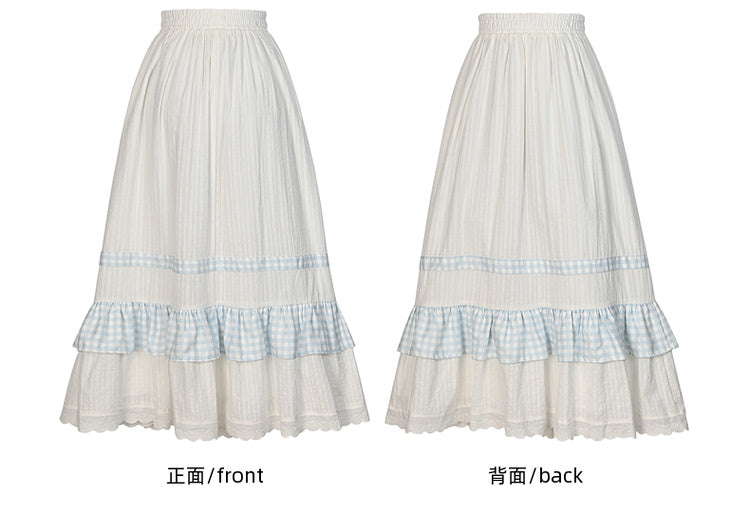 ホワイトハイウエストレーストリムスウィートスカートチェック柄パッチワーク