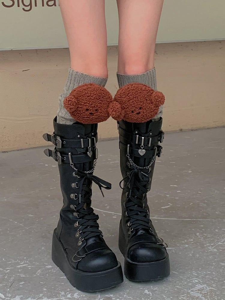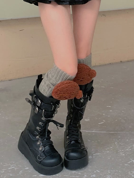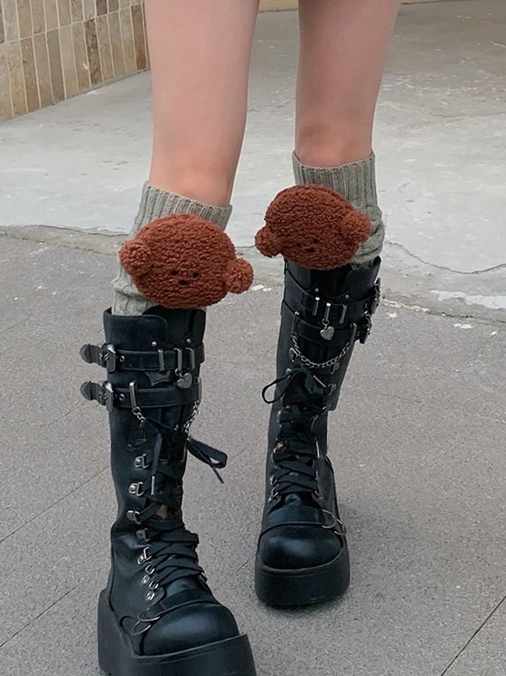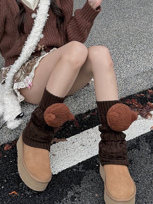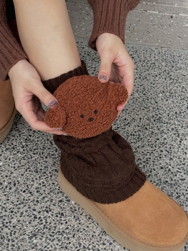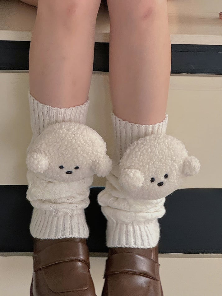 ホワイト/カーキ/ライトグレー/コーヒーのニットレッグウォーマー(子犬のぬいぐるみ付き)