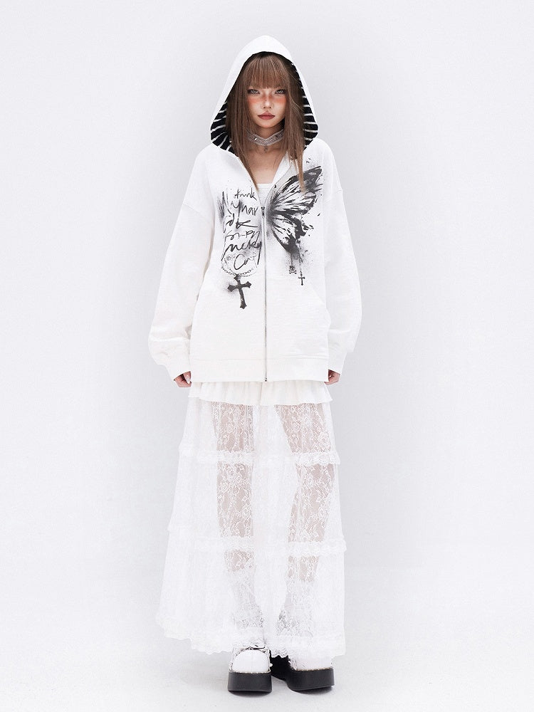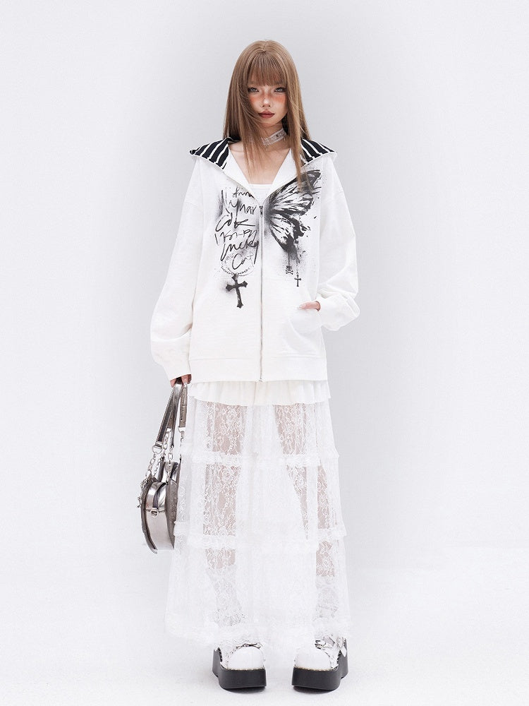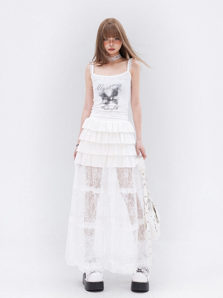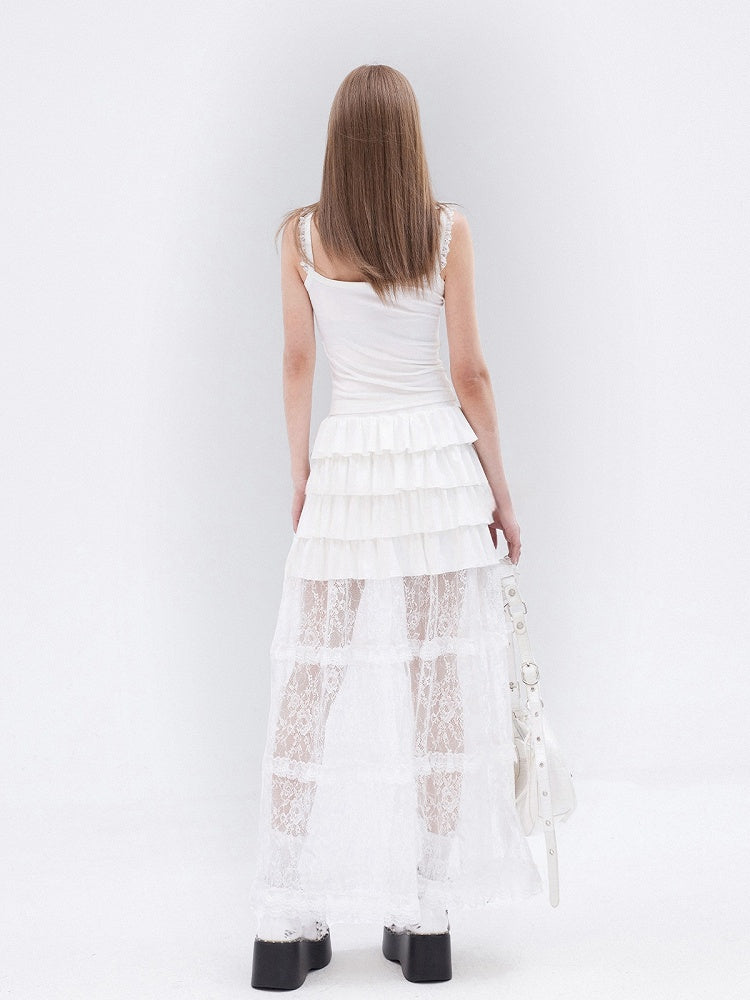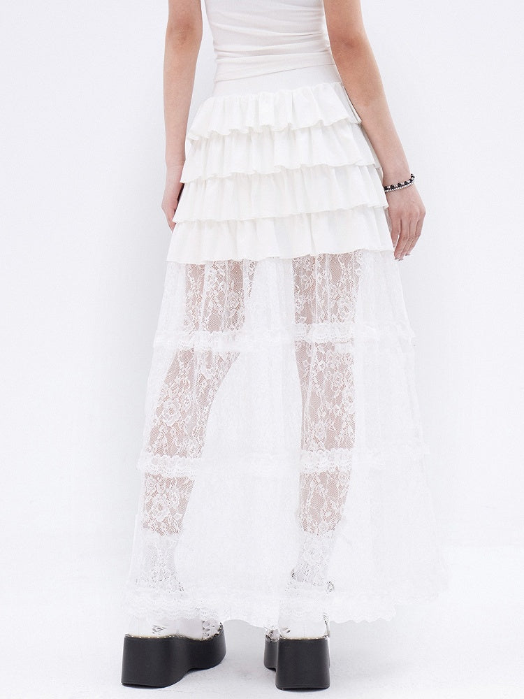 ホワイトレースフリル裾ティアードロングスカート