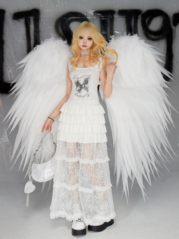 繊細なレースと、魅力的なティアードフリルの裾が特徴の、愛らしい白いロングスカート。エレガントなデザインはどんなシーンにもぴったりで、美しくフェミニンな気分にさせてくれます。この素敵なスカートで、ワードローブに愛らしさをプラスしてみませんか。