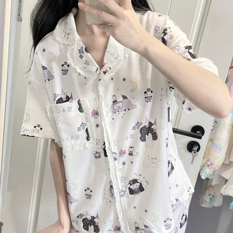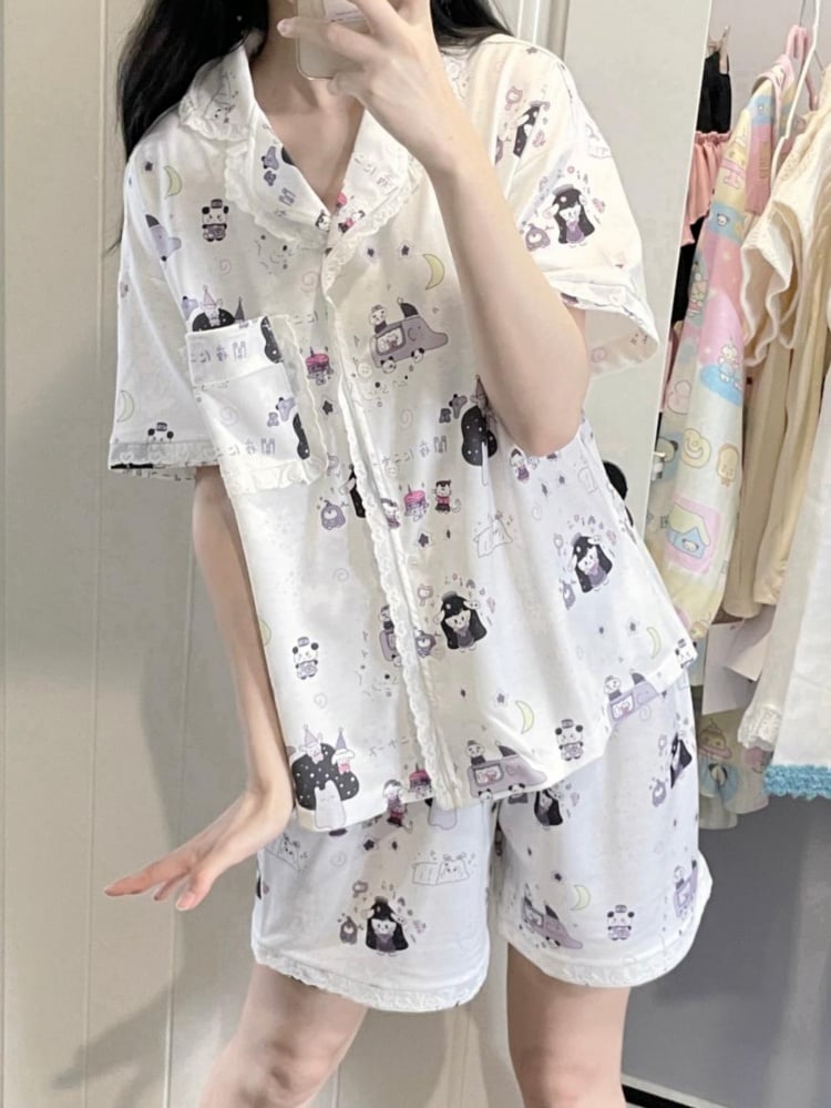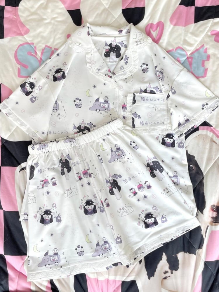 キュートで快適な、ホワイトレーストリムのカートゥーン柄パジャマセットは、リラックスした夜にぴったりです。繊細なレーストリムが魅力を添え、あなたのパジャマコレクションに素敵なアクセントを加えます。この愛らしいセットで、スタイリッシュかつ快適にくつろぎましょう。