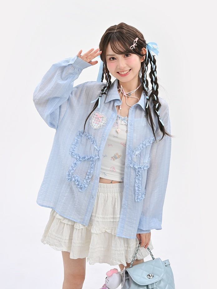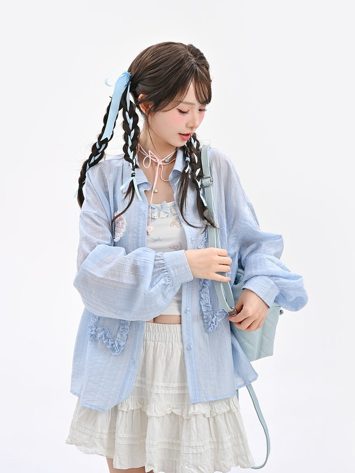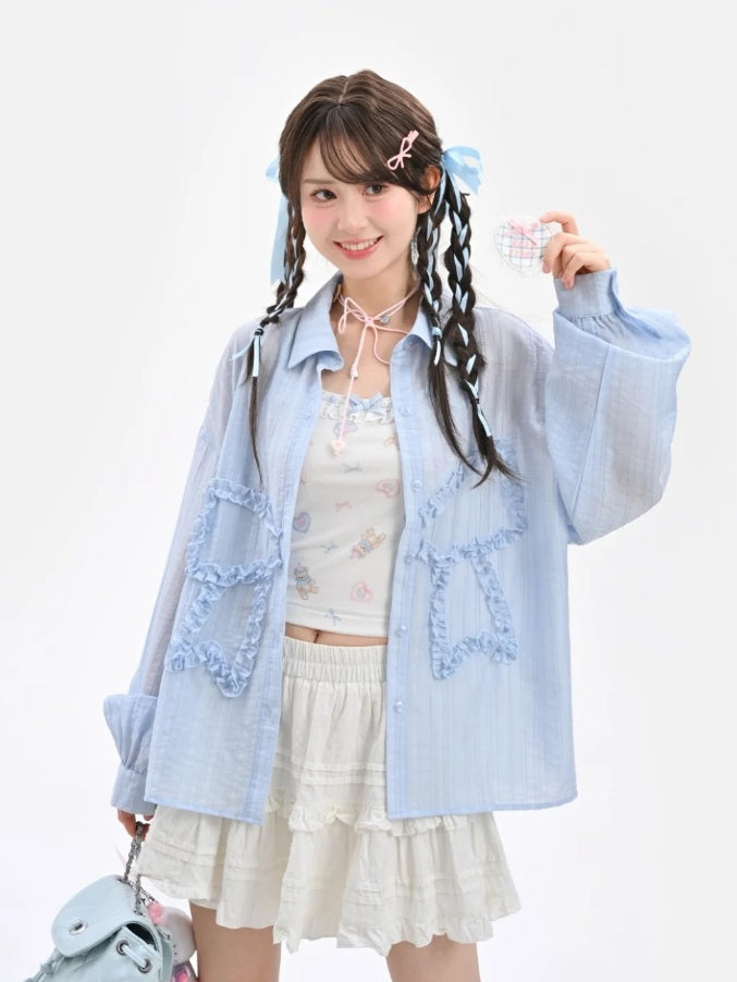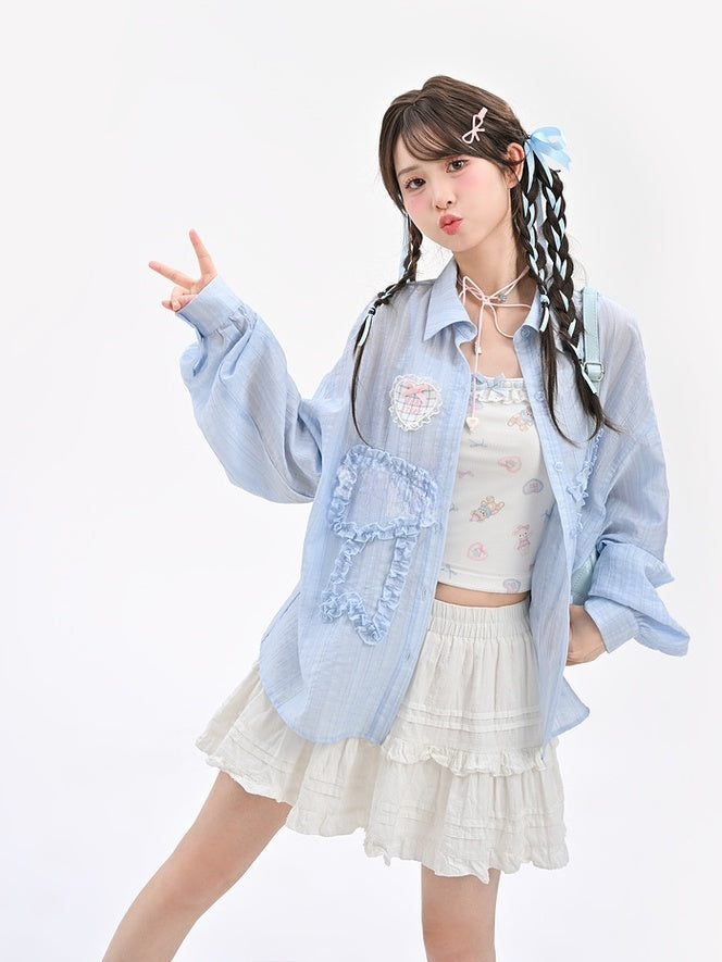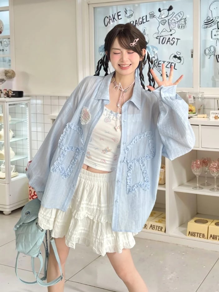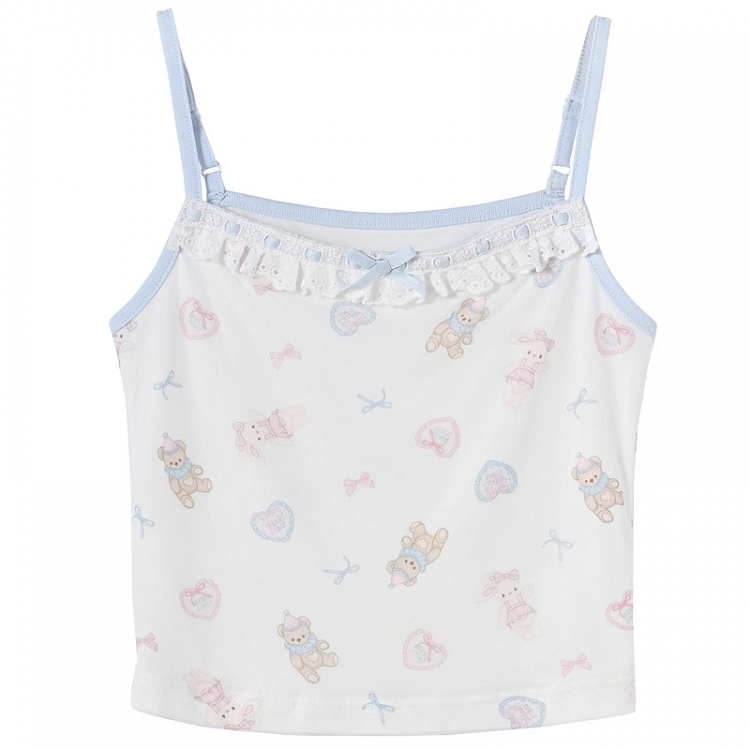 ホワイトレーストリムネックラインクロップド丈キュートベアプリントフリルキャミソールトップス