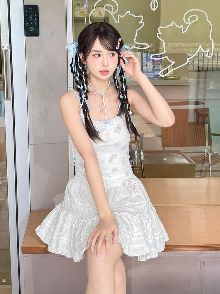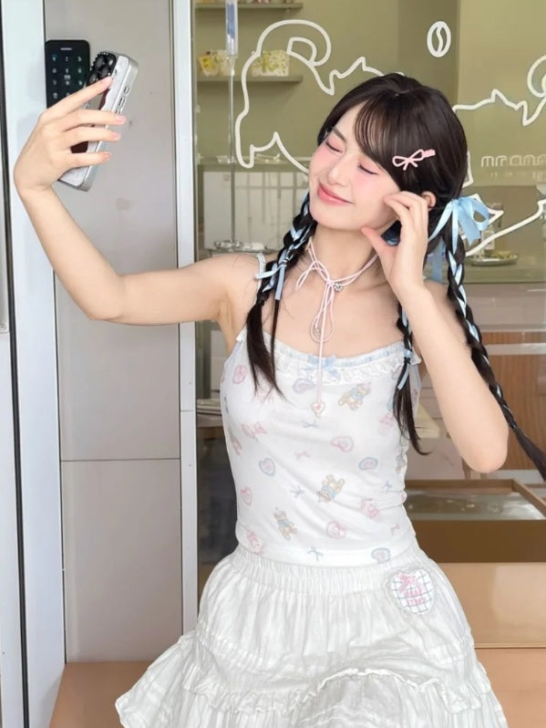 キュートなクマ柄のフリル付きレーストリムネックラインのホワイトクロップド丈キャミソールトップス