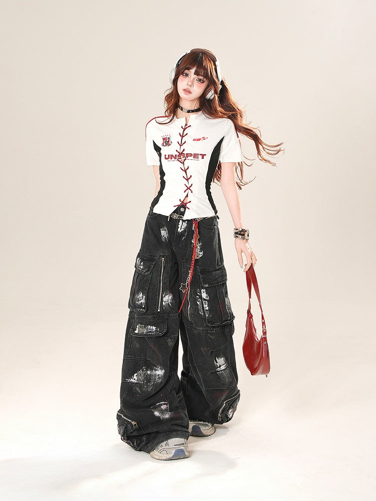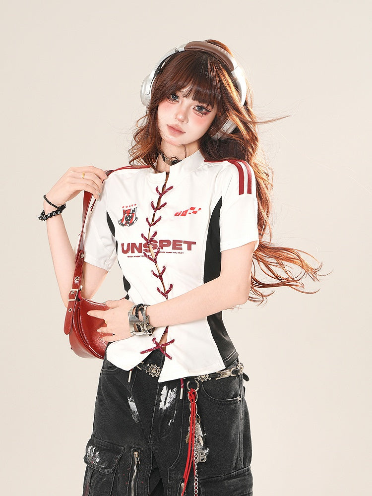 ホワイト レースアップフロント スリムフィット Tシャツ