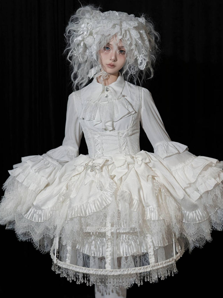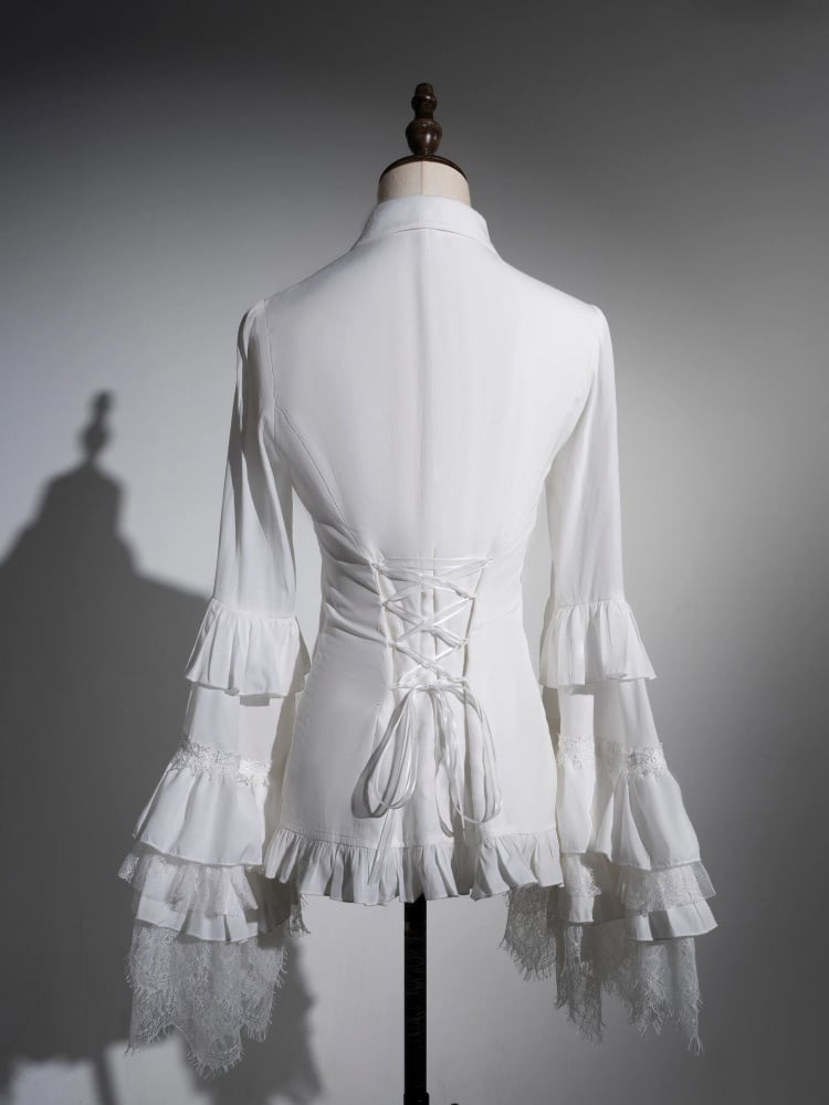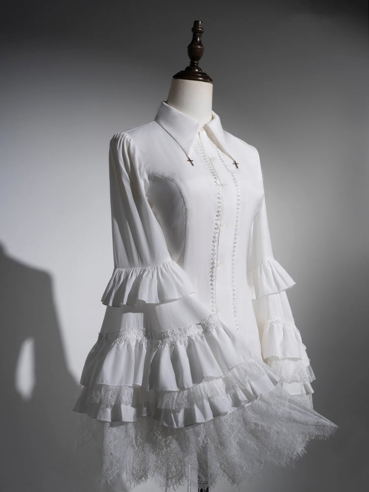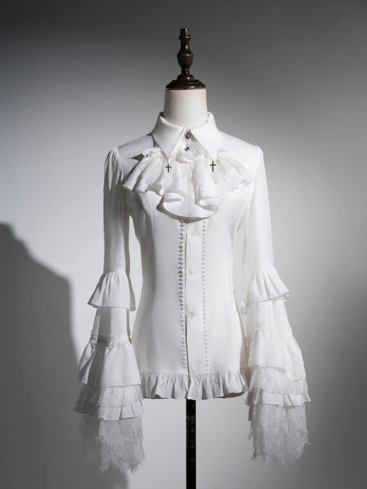 ホワイトレイヤードベルスリーブゴシックロリータシャツクロスチャーム尖った襟