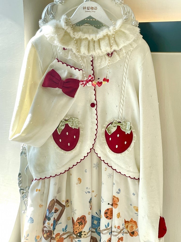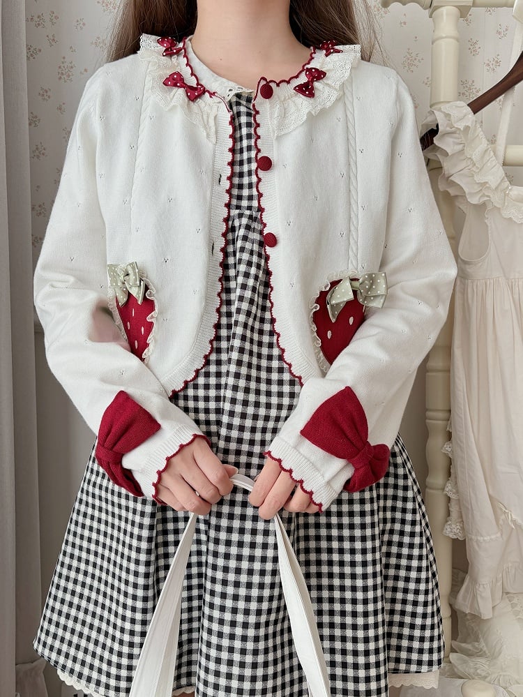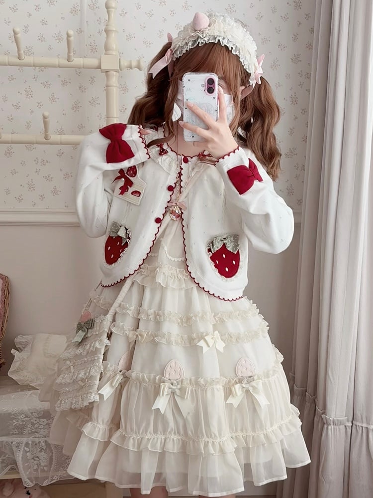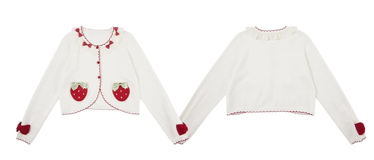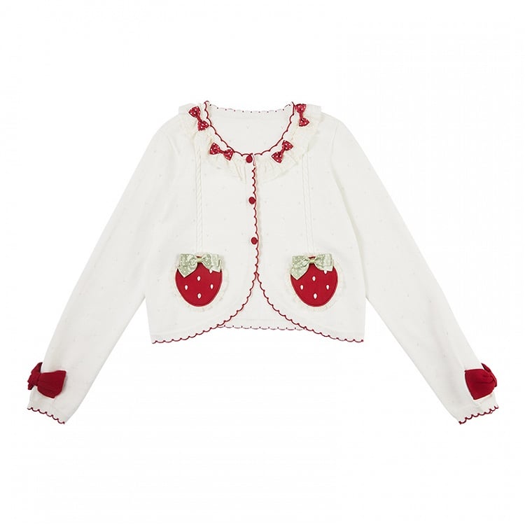 ホワイトの長袖ストロベリーアップリケカーディガン