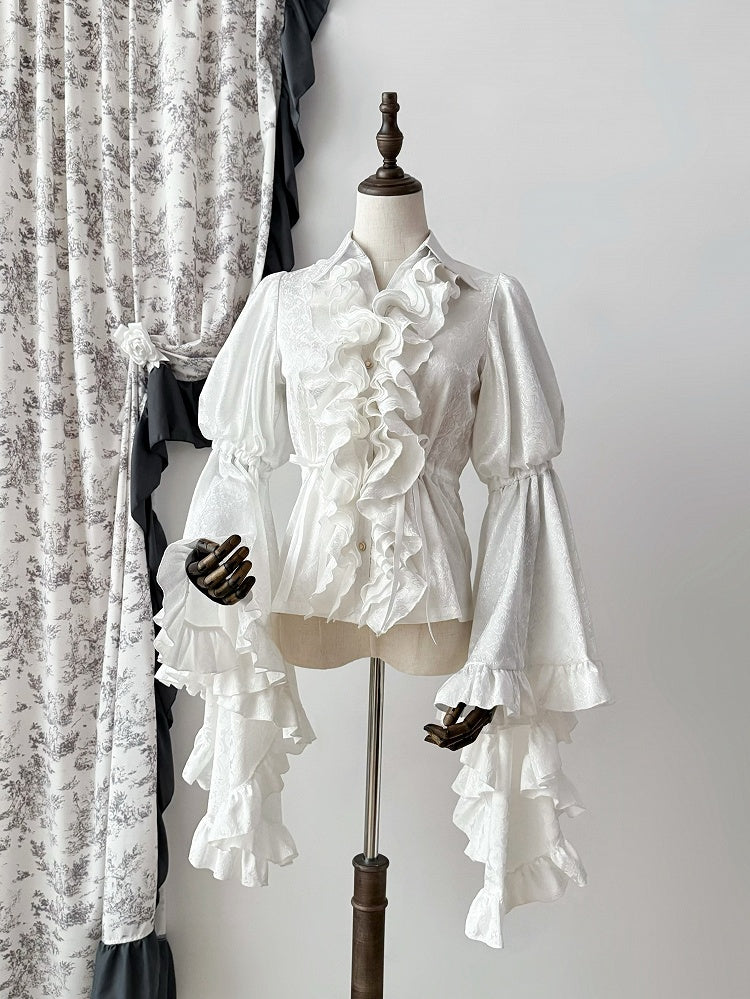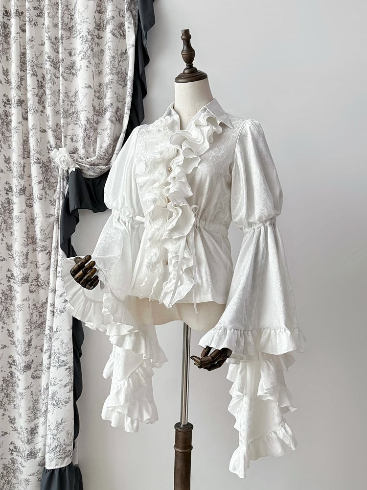 ホワイトのフリルボディスロングベルスリーブロリータシャツ