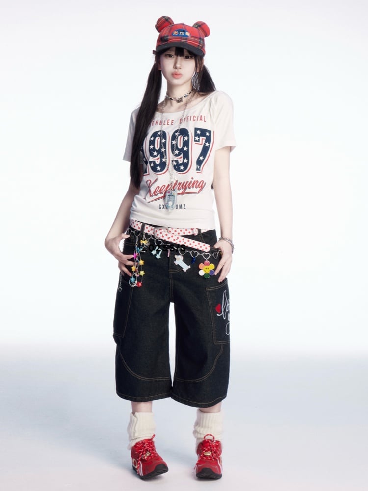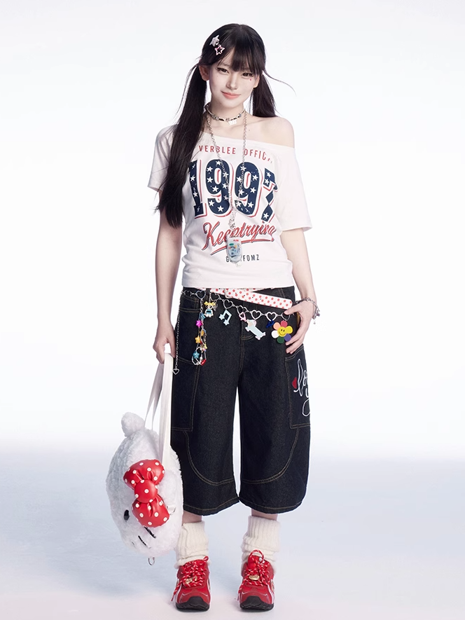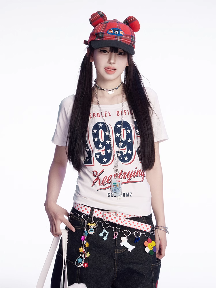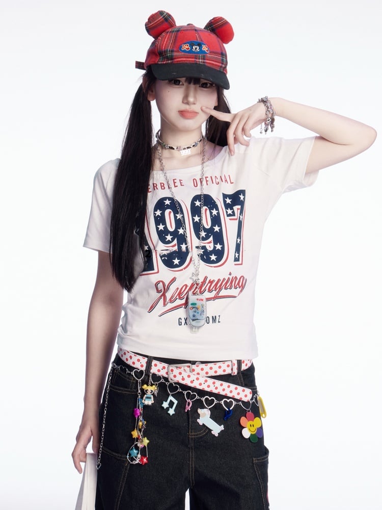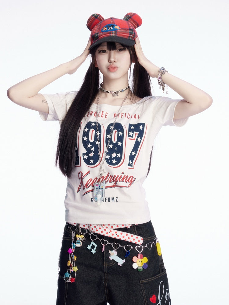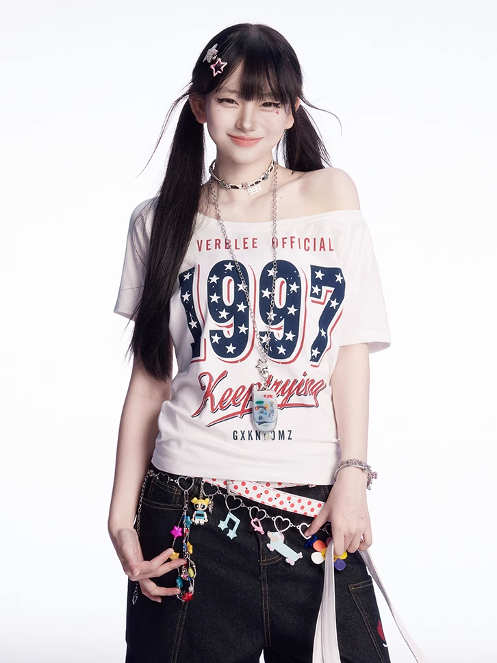 ホワイト アシンメトリーネックライン ナンバープリント ラウンドネック ヴィンテージ Tシャツ