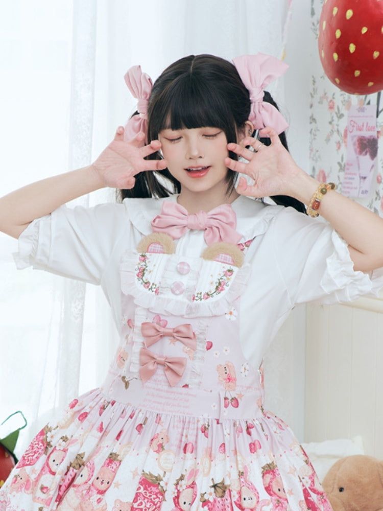 白とピンクのリボン、ピーターパンカラー、そしてスイートなロリータスタイルが特徴のブラウス。どんなコーディネートにもキュートなアクセントを添えてくれます。