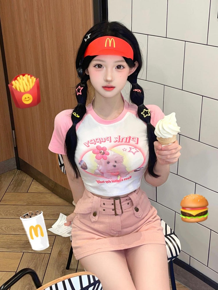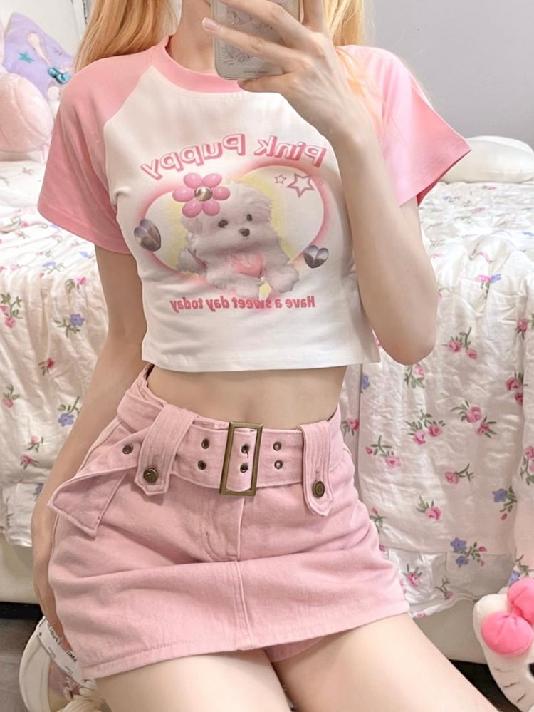 ホワイトピンクのキュートな子犬プリントのクロップドトップス