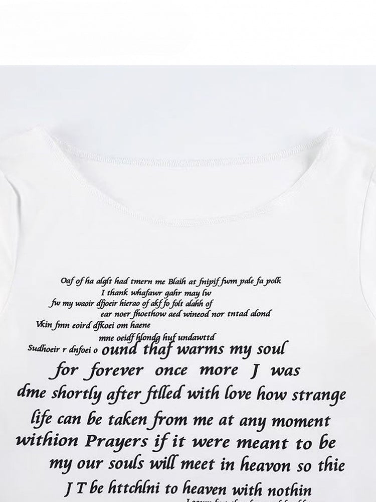 ホワイトプリントベルアシンメトリーレタービタースウィートスリーブヘムトップス