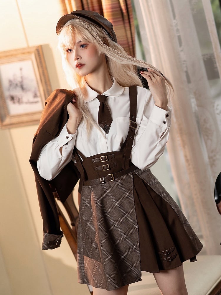 リトル・ディテクティブのプレッピーな白いシャツと茶色のチェック柄サスペンダースカートのオーバーオール、マイラードリアクションの衣装
