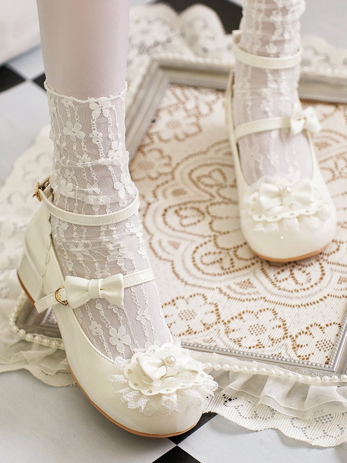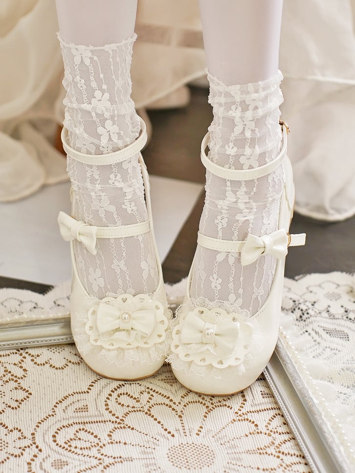 トップにミルキーホワイトのリボン、レーストリム、ハートバックル、ラウンドトゥのロリータシューズ