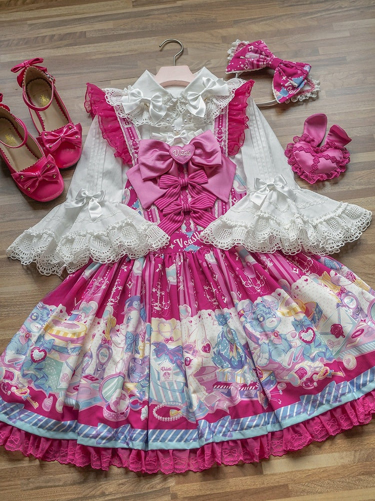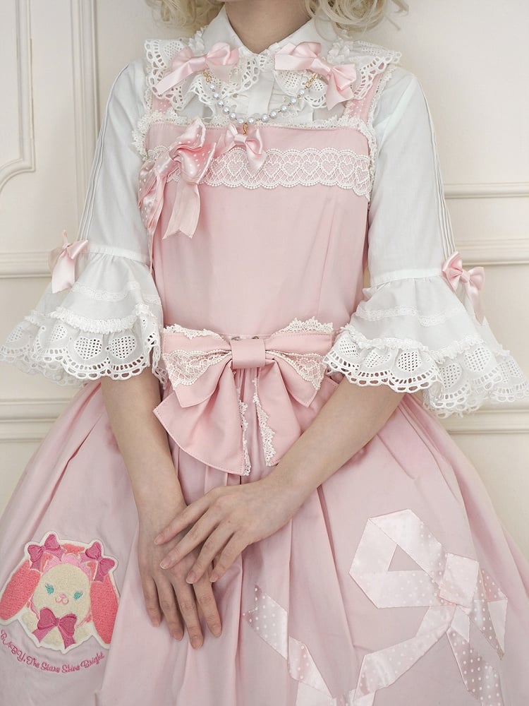 ピンクと白のオールドスクールロリータファッションドレス、蝶結びディテール、ロリータJSKセット