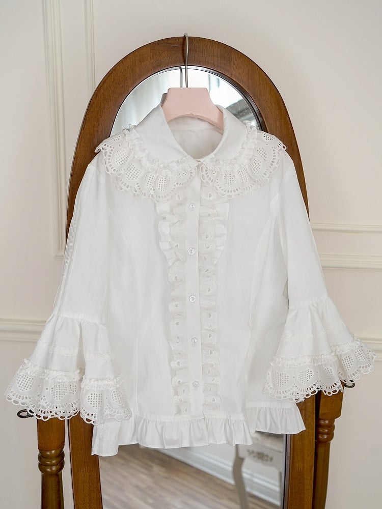 ホワイトラウンドフラットカラーベルスリーブコットンブラウス