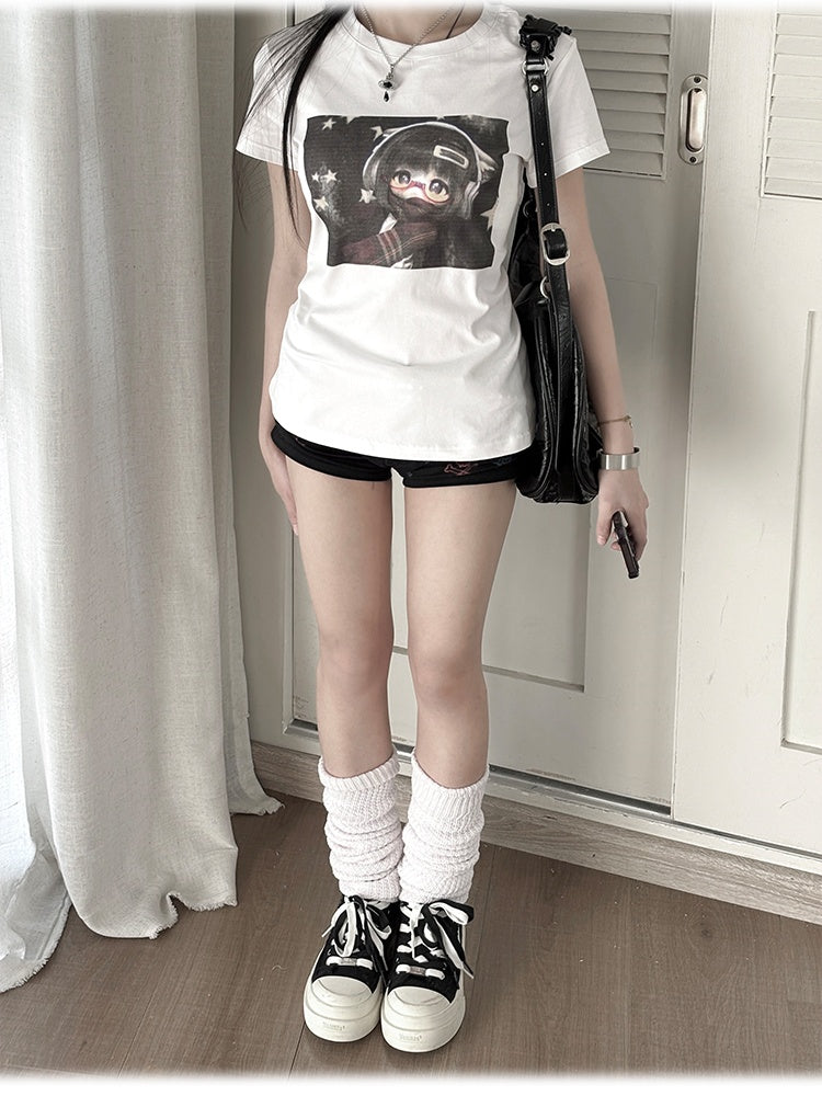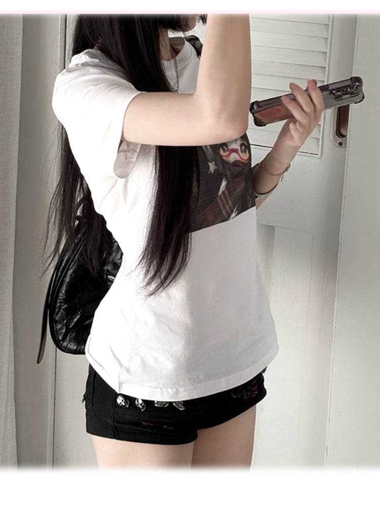 ホワイトラウンドネックBJDドールプリントヴィンテージTシャツ
