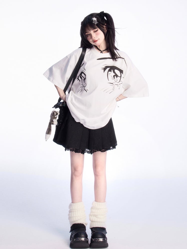 ホワイトラウンドネックアイプリントルーズTシャツ
