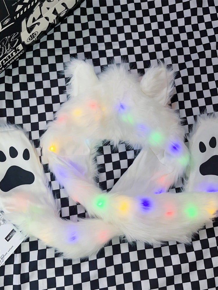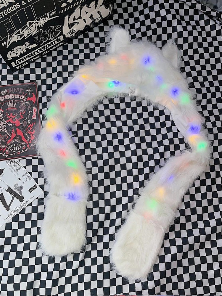 ホワイトのシャギースカーフとグローブ、ハットのオールインワンで、暖かくキュートな装いを。柔らかくシャギーな素材が暖かさを保ち、内蔵のLEDライトが視認性を高めます。肌寒い夜のお出かけにも、暖かい室内でも活躍します。