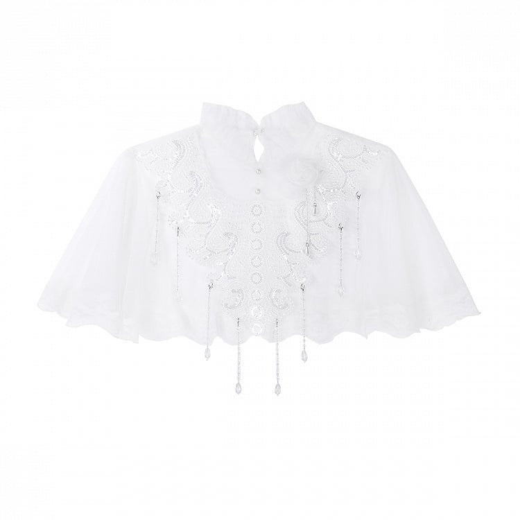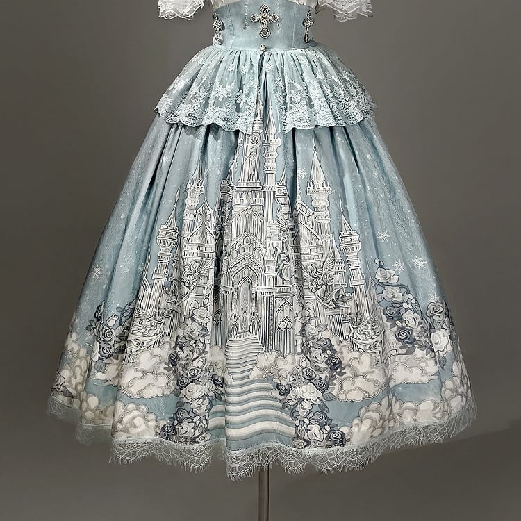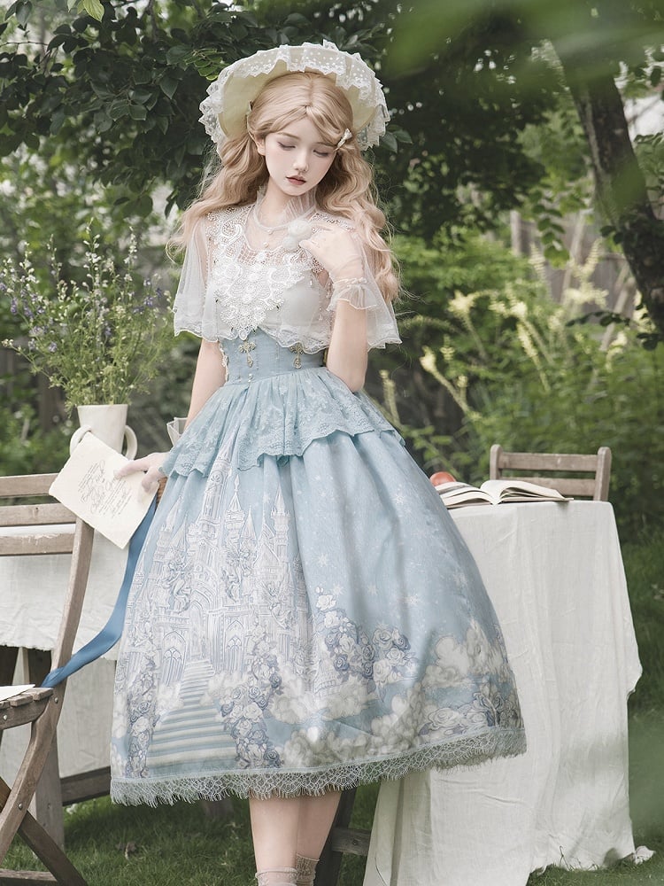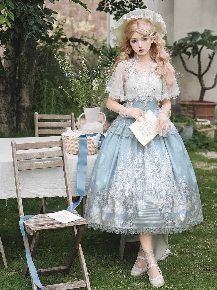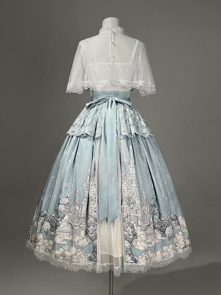 ホワイトキャミソールトップ + チュールケープ + キャッスルプリントブルーハイウエストスカート エレガントクラシックロリータフルセット