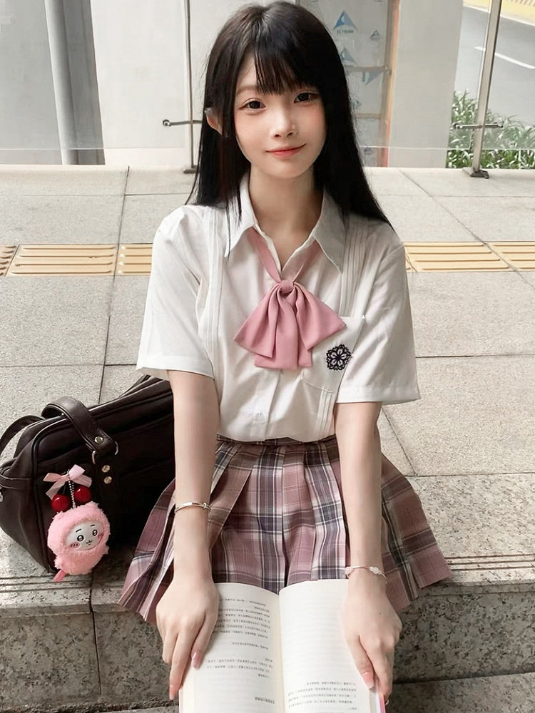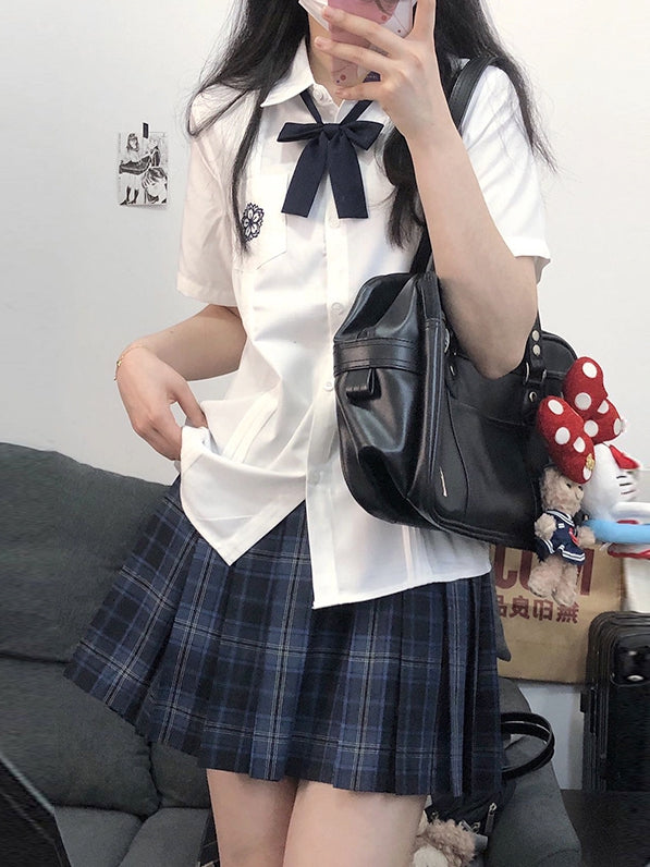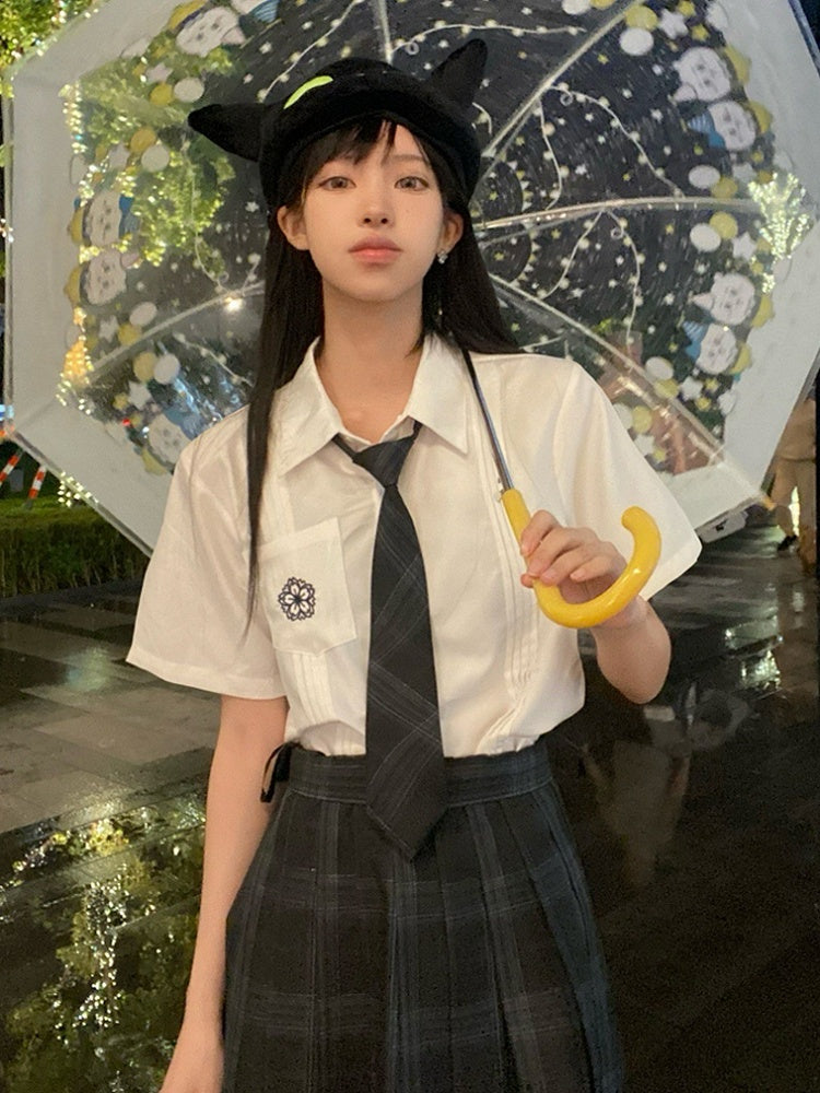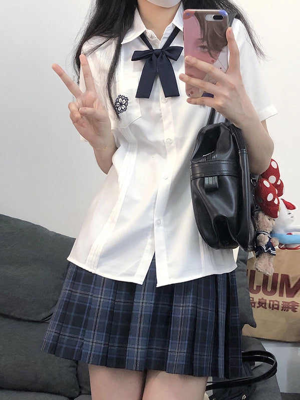 White Preppy Style Floral Embroidery Pleating Details JK Uniform Short Sleeves Shirt