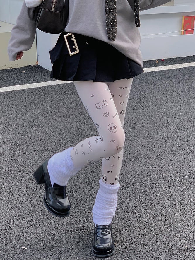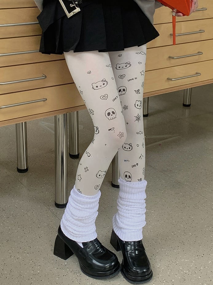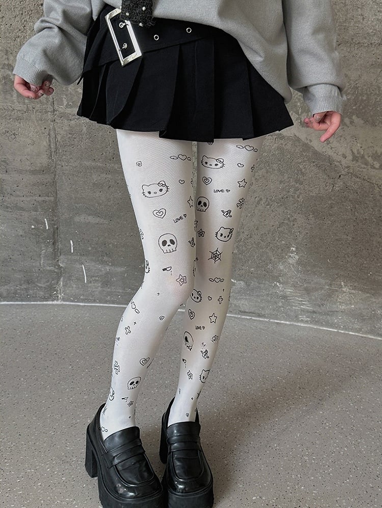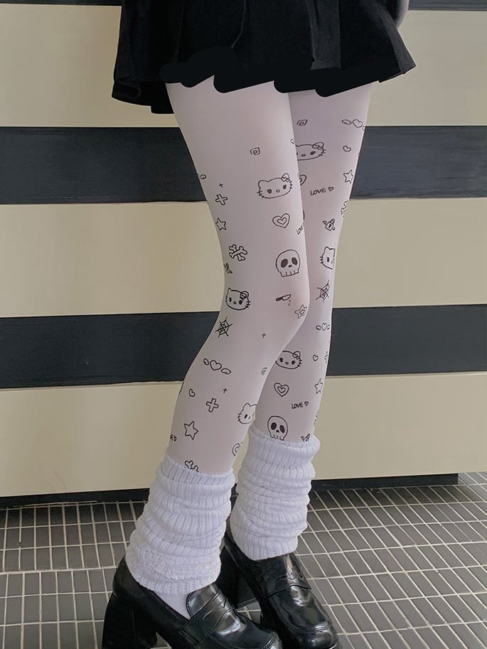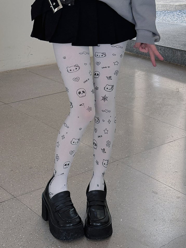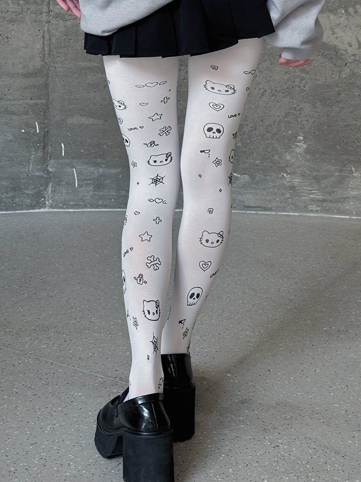 ホワイトのスイートキティハートスタープリントカートゥーンタイツ