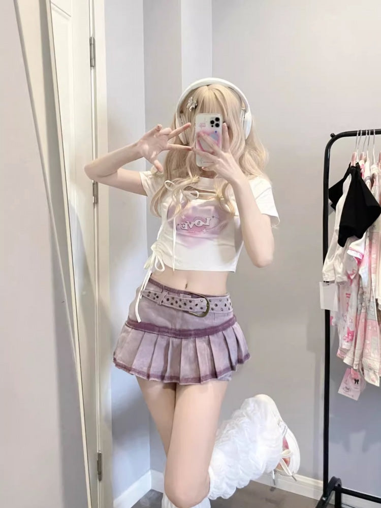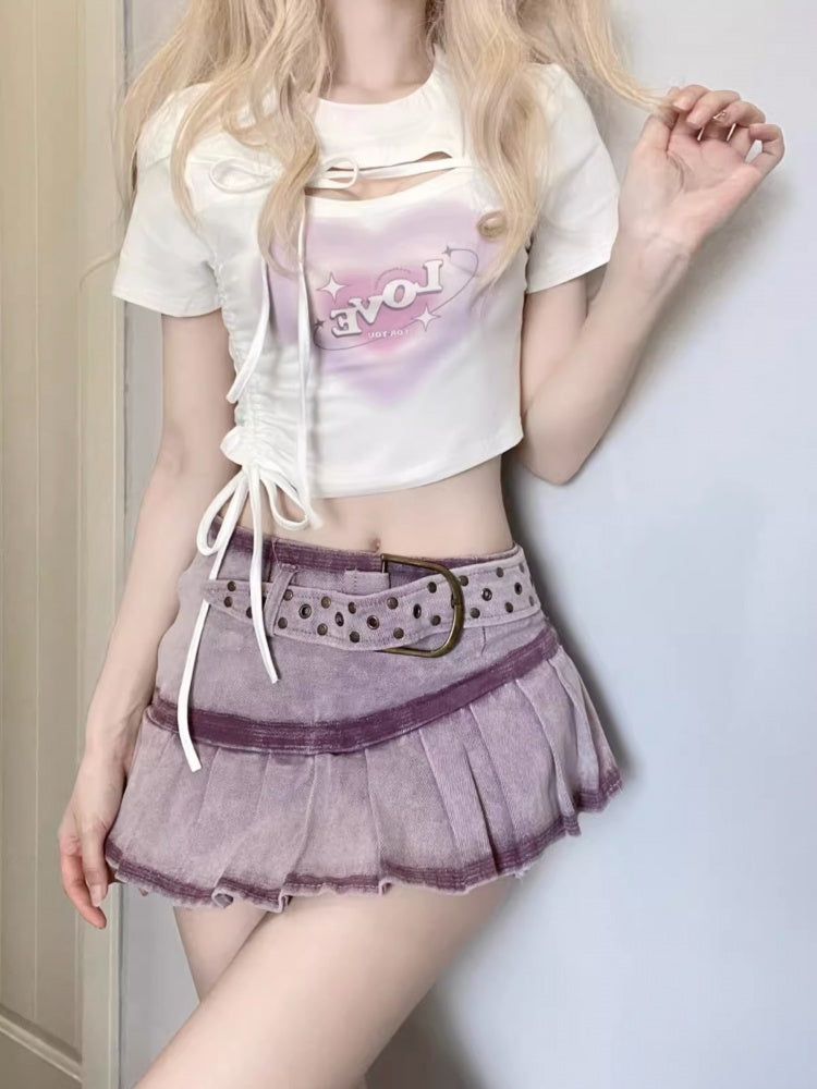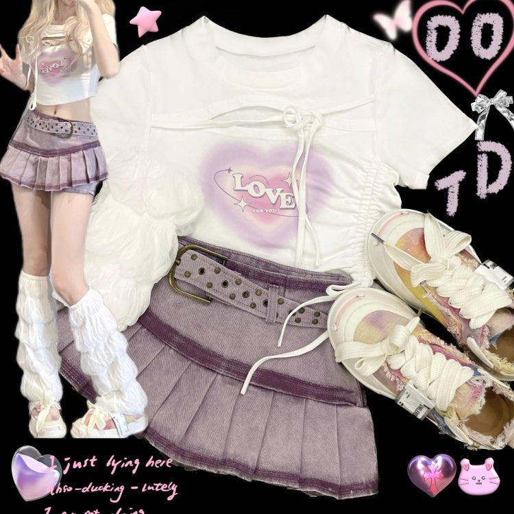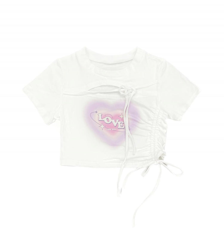ホワイト スウィートハートプリント ドローストリング クロップドトップ