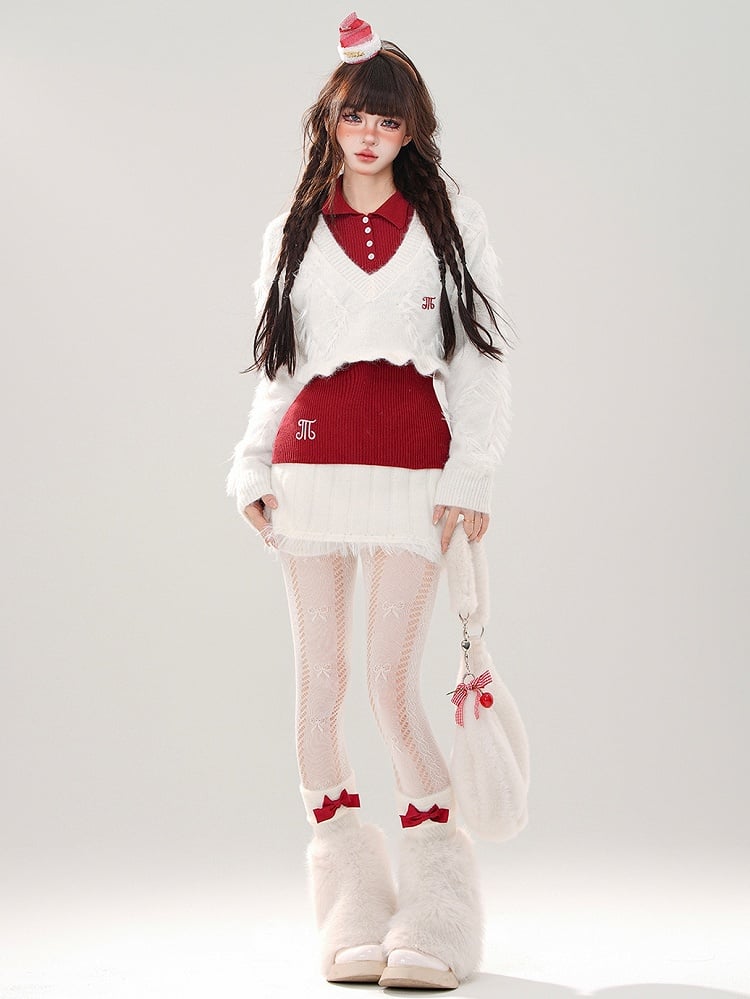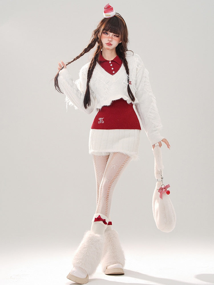 ホワイトVネッククロップドセーター + レッドニットトップス + ホワイトミニスカートセット