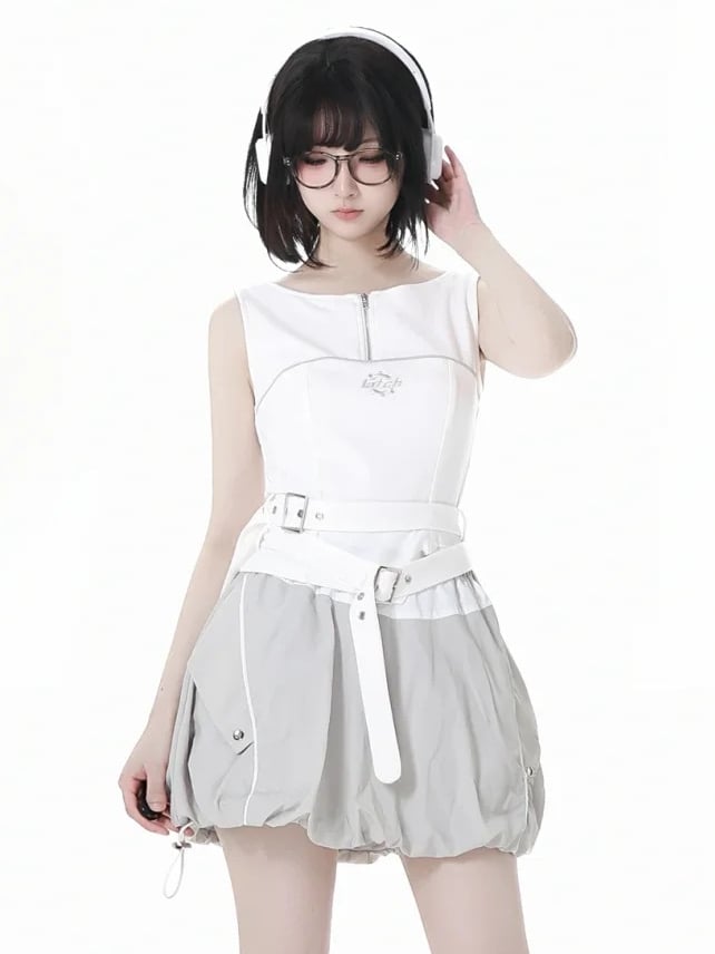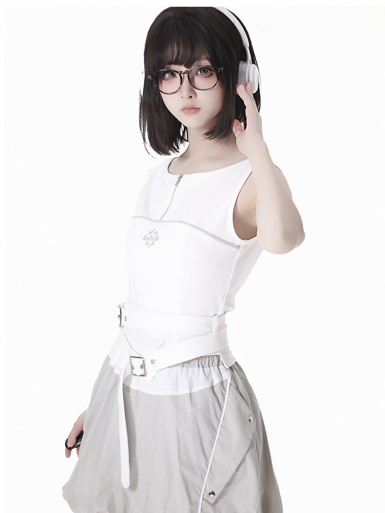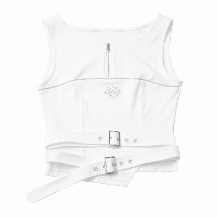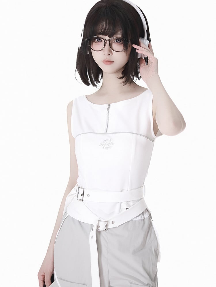 ホワイトジッパーネックラインバックルストラップテックウェアタンクトップ
