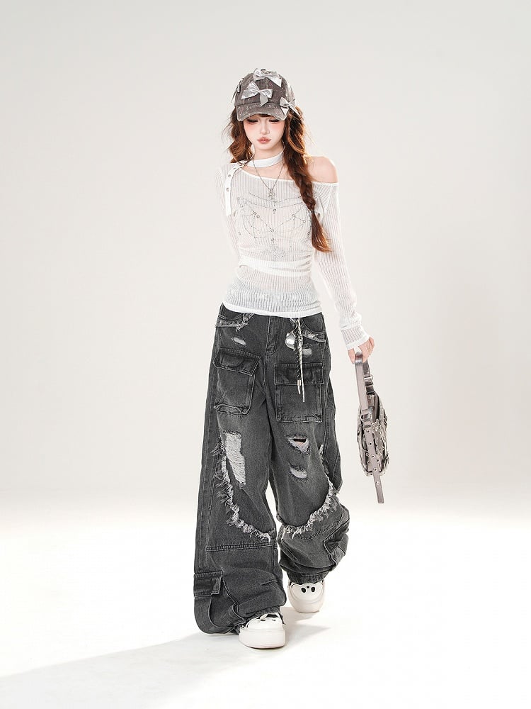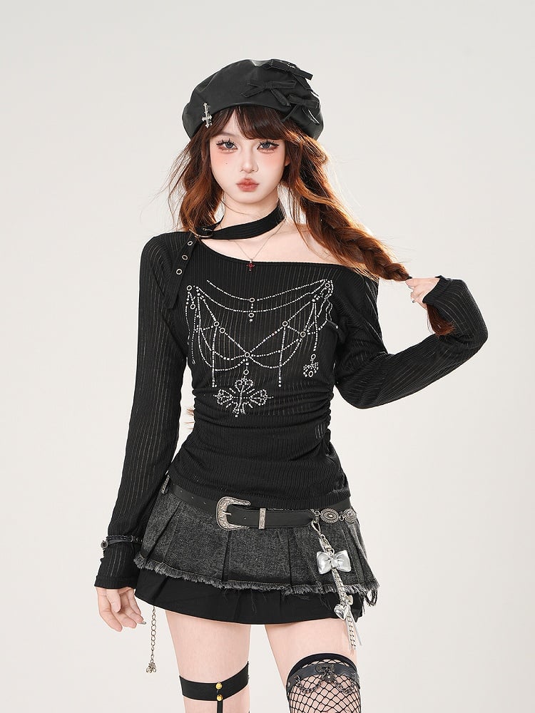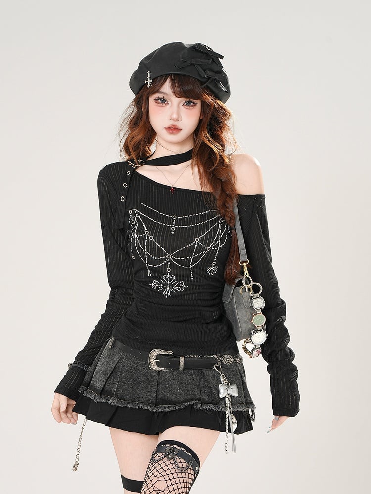 ホワイト/ブラックのアシンメトリーネックライン、ラインストーンディテール、バックル