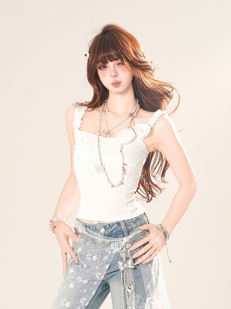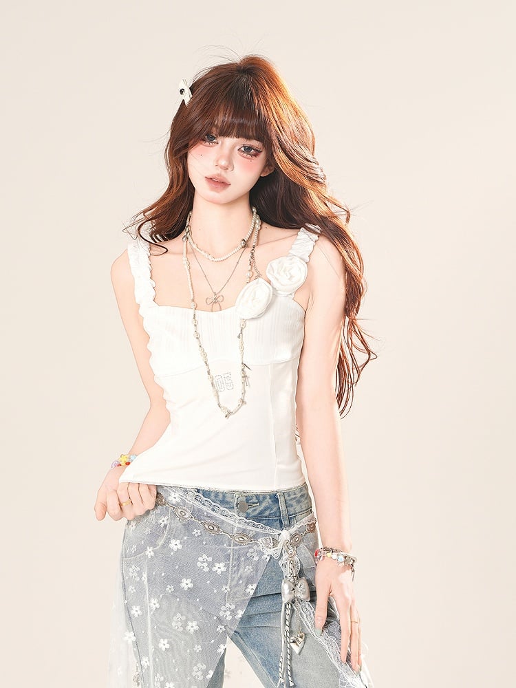 ホワイト/ブラック ノースリーブ トップス スクエアネック 花柄装飾