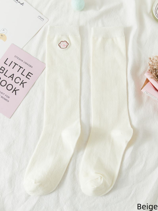 White/Black/Beige Cute Kitten Paw Embroidered Calf Socks