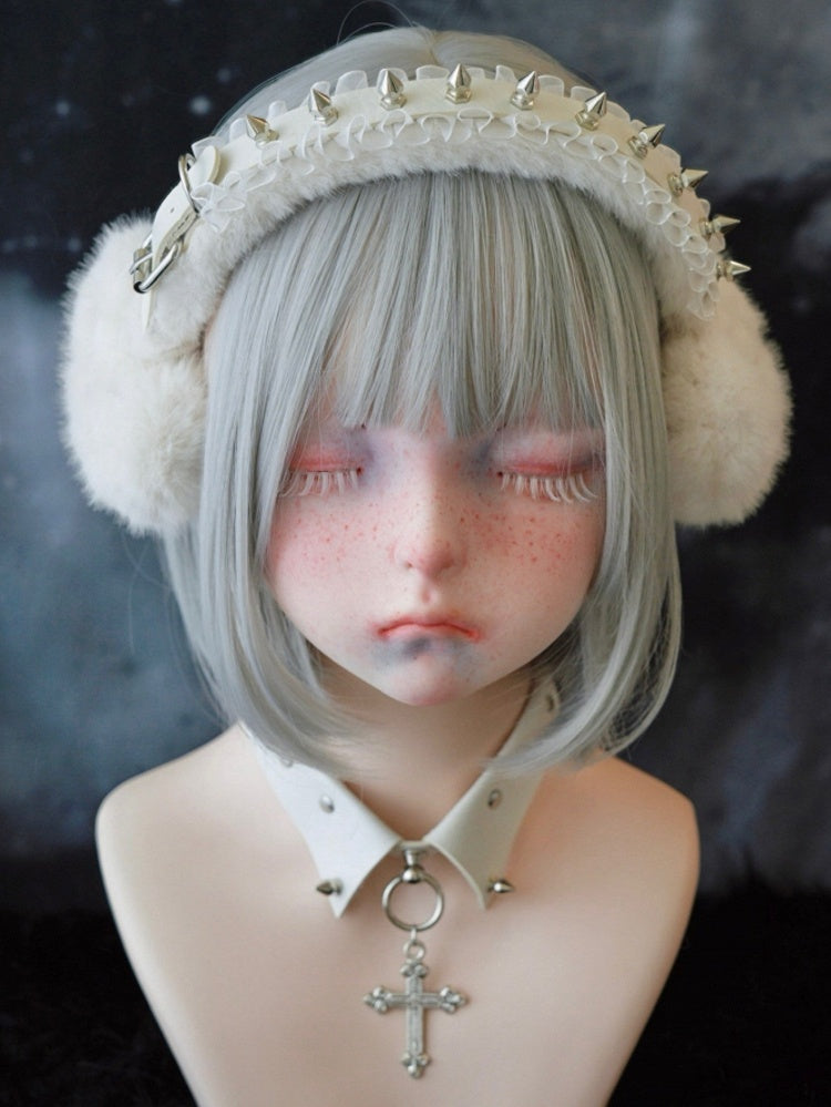 ホワイトのハンドメイドスタッドとピン、フリルヘムのハート型プラッシュイヤーマフ