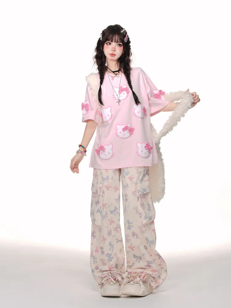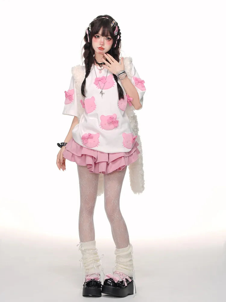 ホワイト/ピンクのかわいい猫柄の蝶結びTシャツ