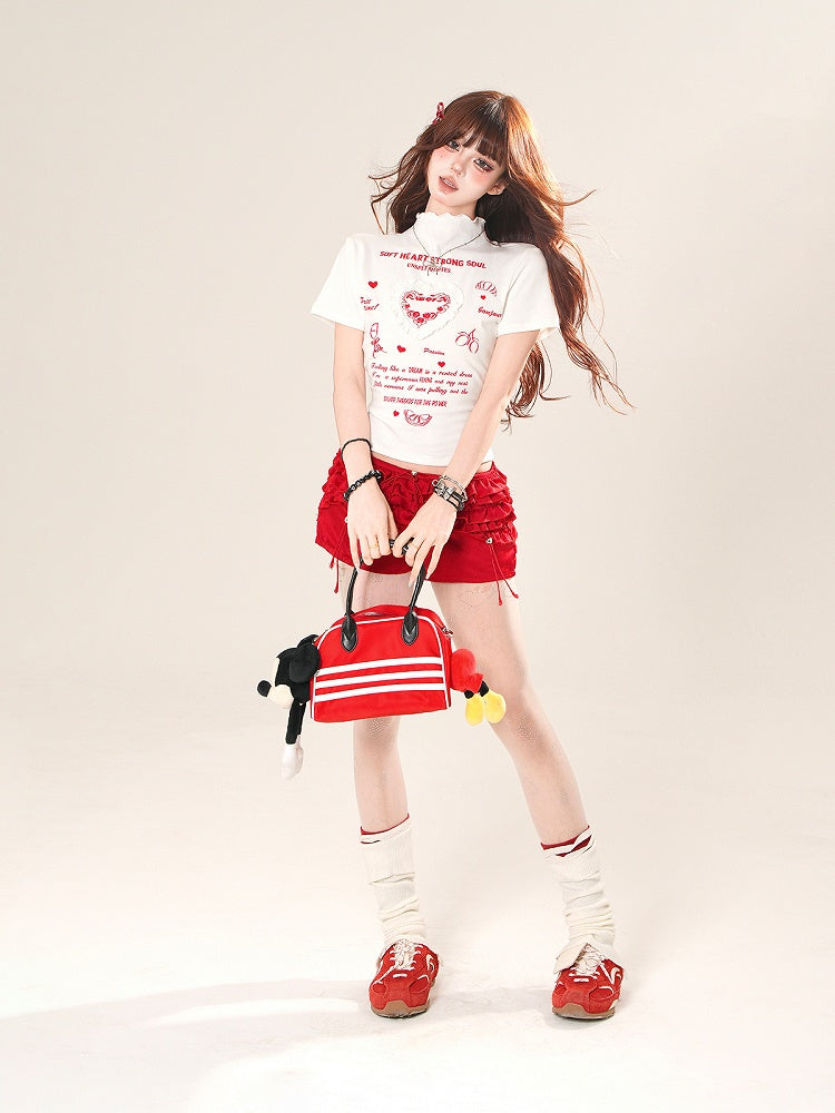 ホワイト/イエロー ハイネック フリル ハート グラフィック Tシャツ