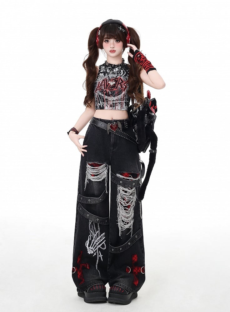 グレー/レッドのチェック柄、フェードウォッシュ、ダメージ加工、穴あき、ヴィンテージパンク、ワイドレッグジーンズ