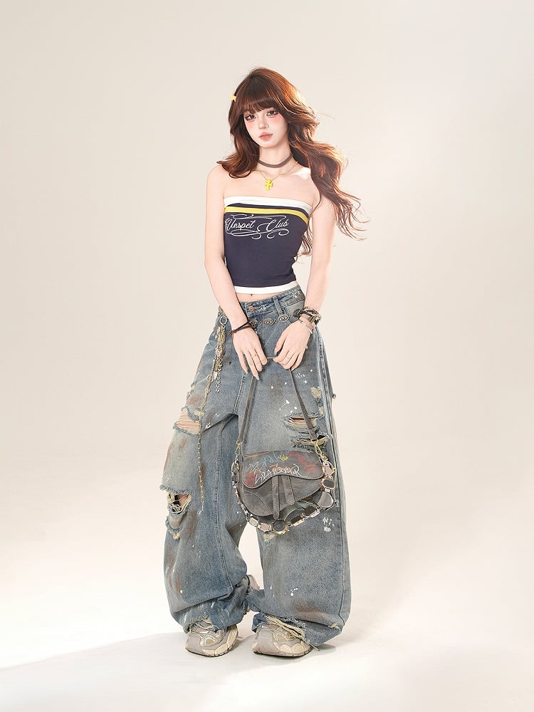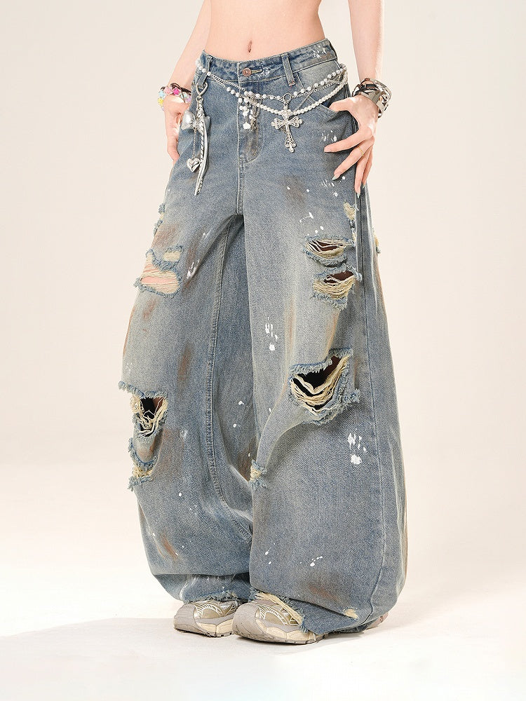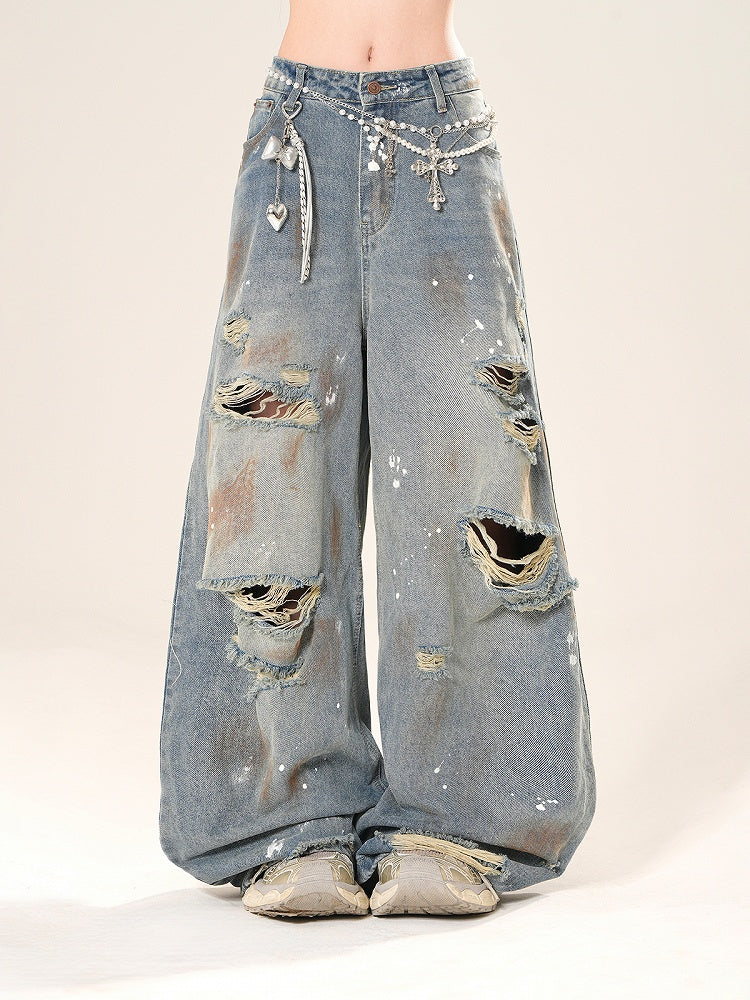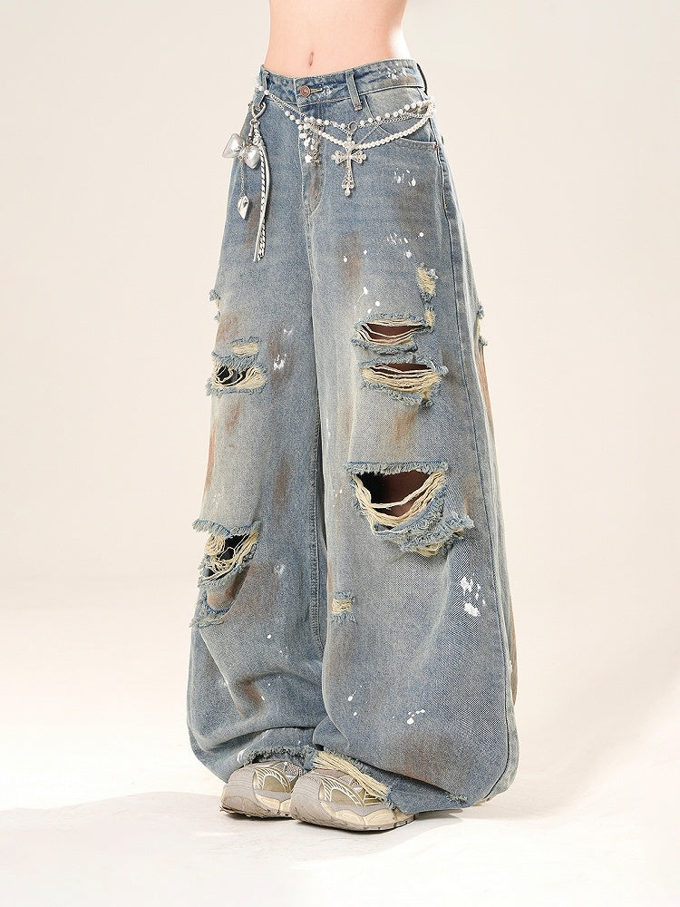 ワイドレッグジーンズ、股上はダメージ加工、穴あき、ブルースプレー、ロープリントペイント