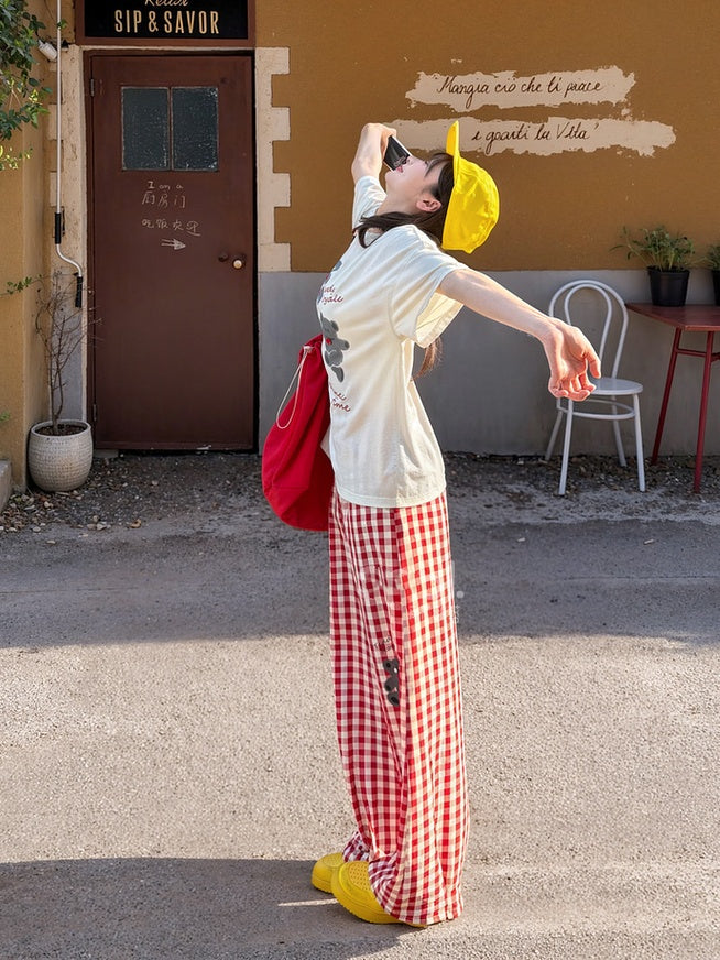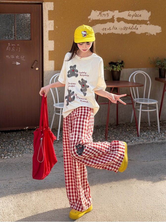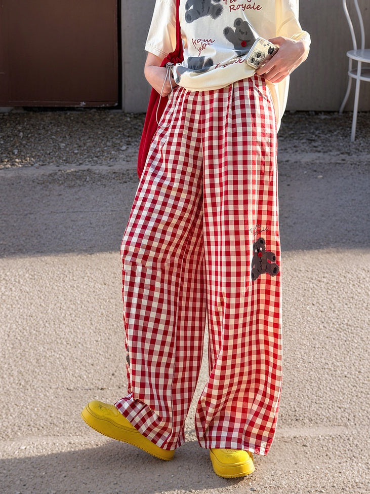 赤と白のチェック柄ベアプリントワイドレッグパンツ ショート/ロングバージョン