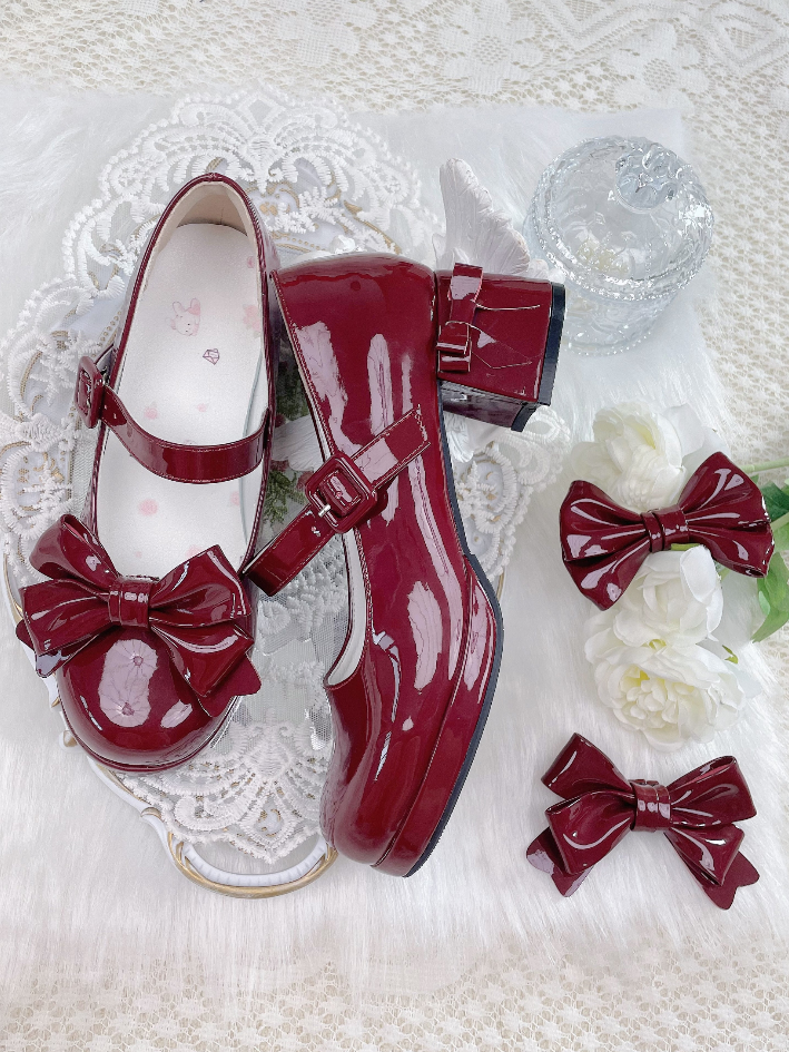 ワインレッドの蝶結びバックルストラップブロックヒールロリータメリージェーン