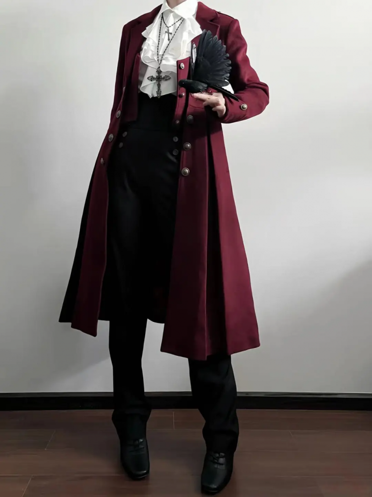 エレガンスとミステリアスさが完璧に融合した、この優美な一着は、ゴシックスタイルの永遠の魅力を愛する人のためにデザインされています。上質なウール素材で仕立てられたこのコートは、肌寒い季節に温かさと快適さを提供します。コートのフロントには美しいゴールドトーンのボタンがあしらわれ、デザイン全体に高級感と洗練された雰囲気を添えています。ユニークなフェイクツーピースデザインは、コートの下にウエストコートを重ね着しているかのような印象を与え、精巧な美しさをさらに引き立てています。王子ファッションのトレンドを取り入れたい方にも、装いにドラマチックなアクセントを加えたい方にも、このコートはファッションに敏感な方にとって欠かせないアイテムです。