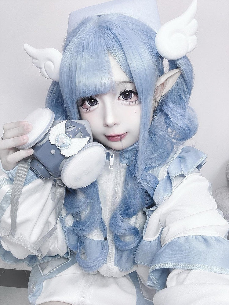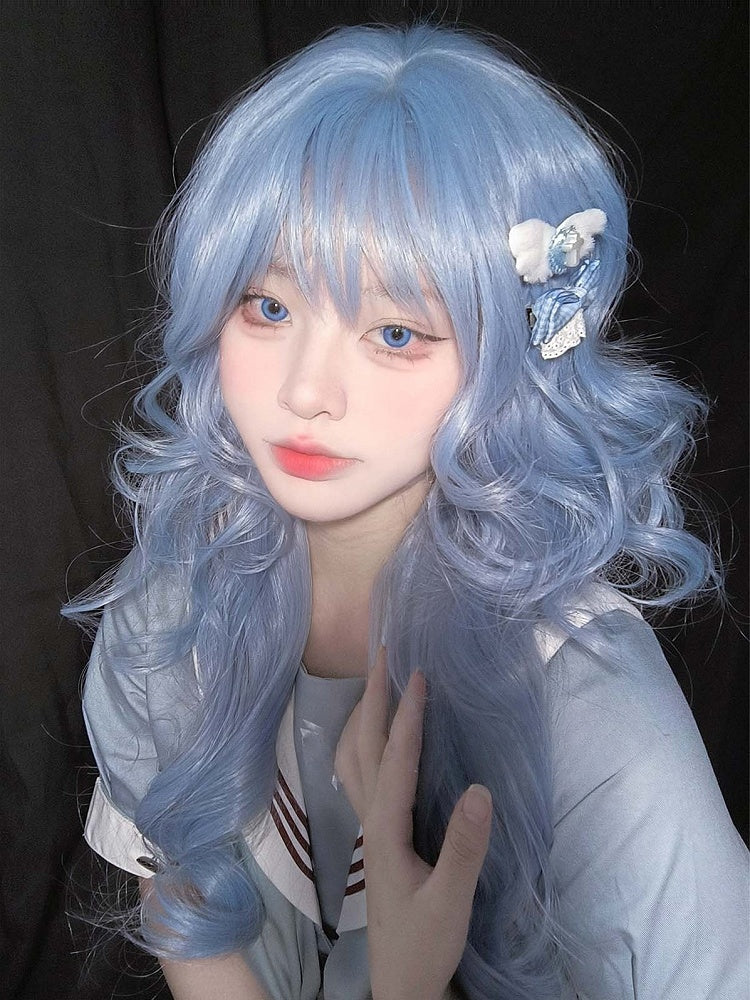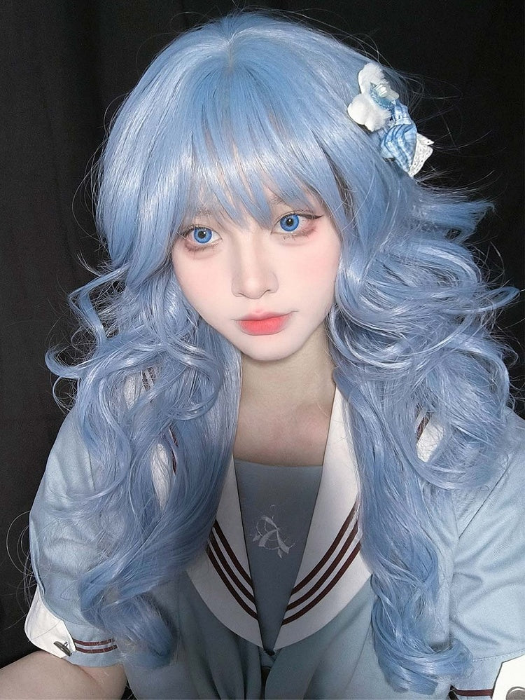 エアウィッグ付き 70cm 長さ 前髪 ウェーブ ブルー