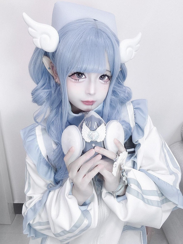 青と白のオールドスクールロリータファッションドレス 蝶結びディテール JSK セット
