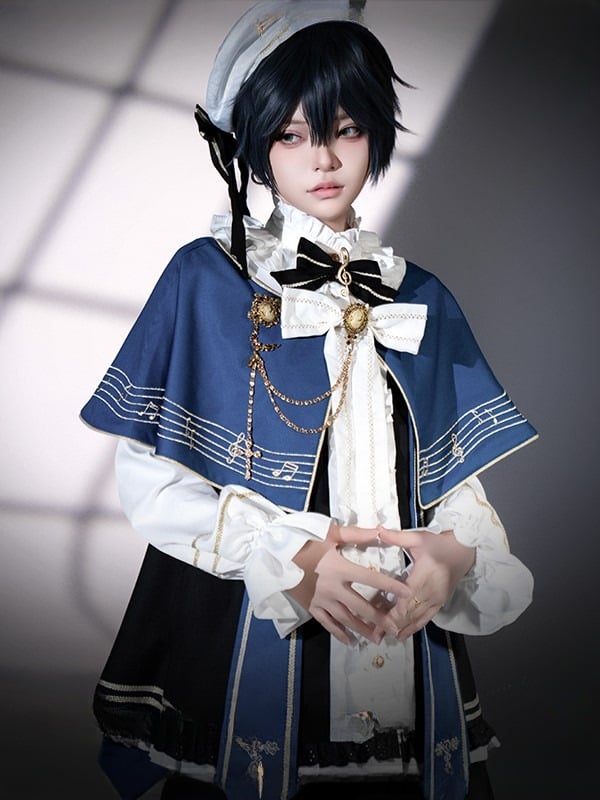 Blue and White Musical Note Embroidered Ouji Lolita Top with Capelet + Shorts Full Set