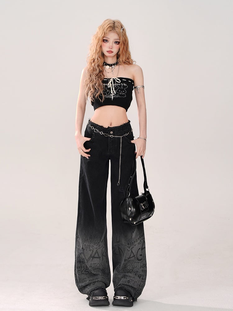 Gyaru Black Crop Tube Top: Bow Tie Front with Cute Bunny Print
